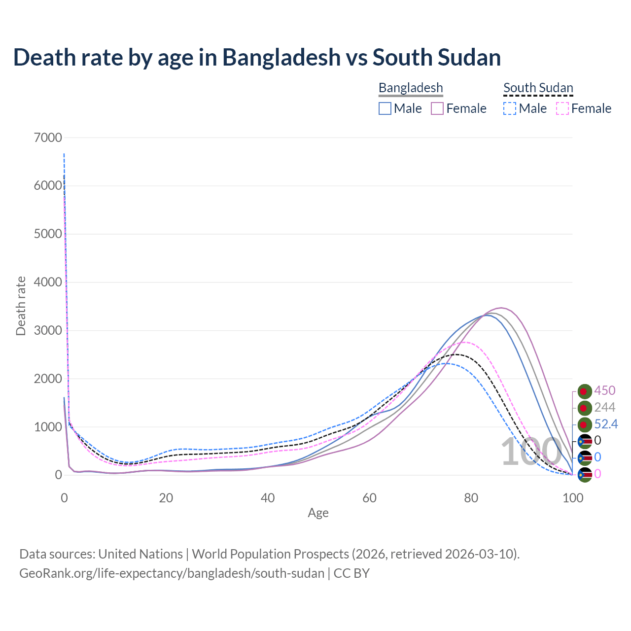 In Bangladesh, the most common age of death is 84, compared to 0 in South Sudan. The median age of death is 79.7 in Bangladesh and 67.5 in South Sudan, meaning only half of each cohort is expected to live past that age.