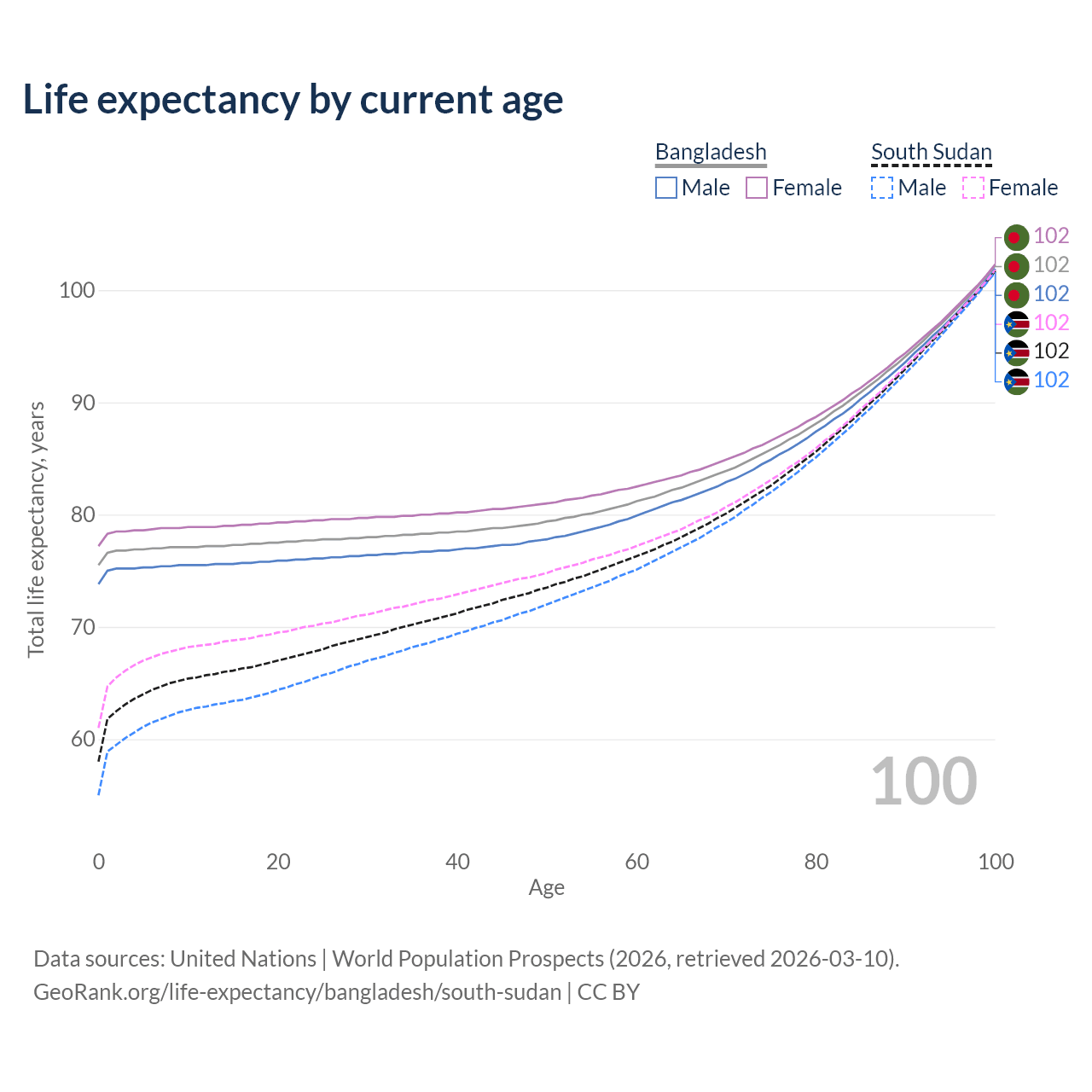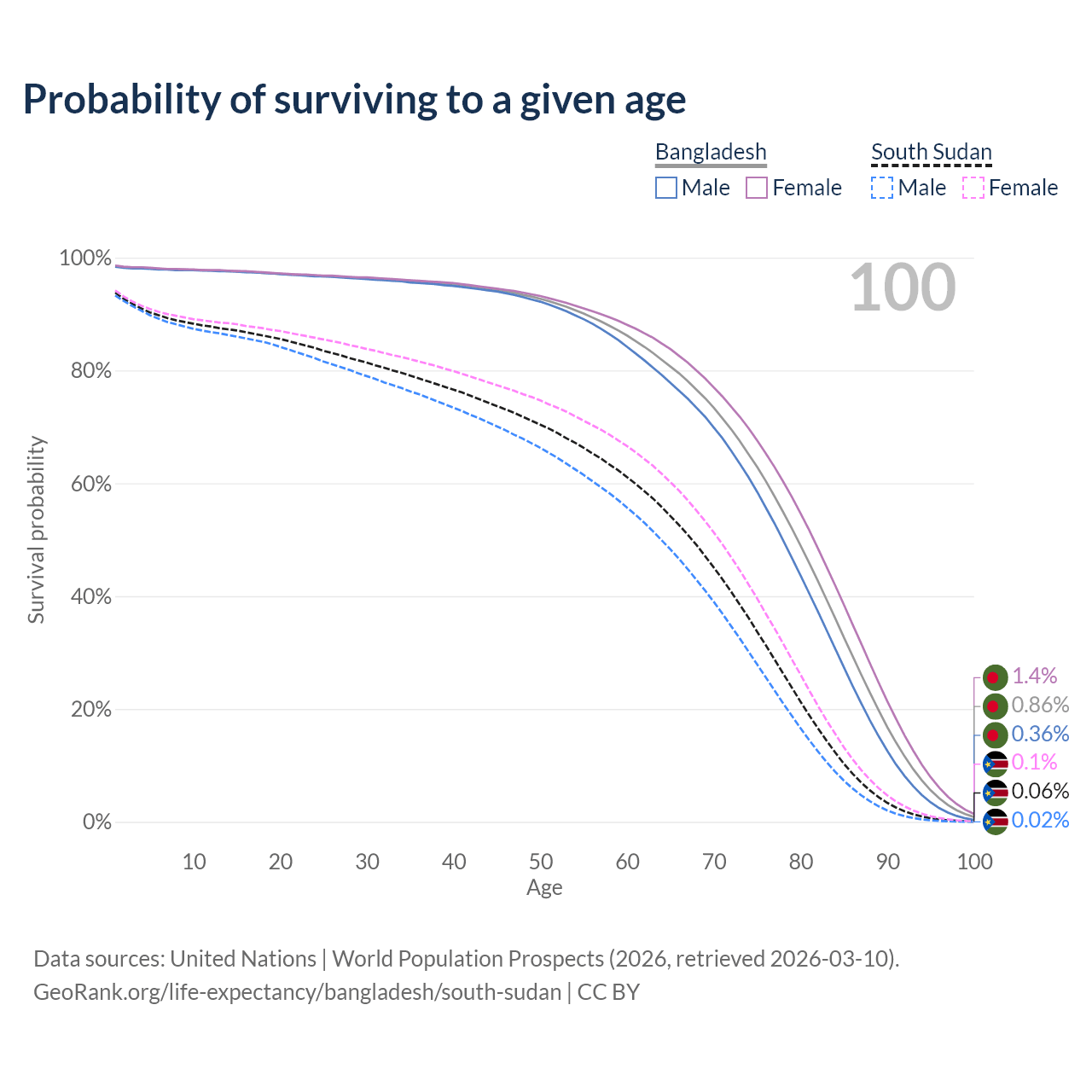 This life expectancy calculator shows the odds of living to 100, 95, 90, and below based on current age for both males and females in Bangladesh and South Sudan, along with mean and median age of death. The calculations are based on the 2026 life tables (actuarial tables) from the UN World Population Prospects.