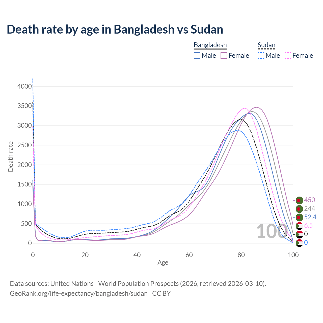 In Bangladesh, the most common age of death is 84, compared to 0 in Sudan. The median age of death is 79.7 in Bangladesh and 74.1 in Sudan, meaning only half of each cohort is expected to live past that age.