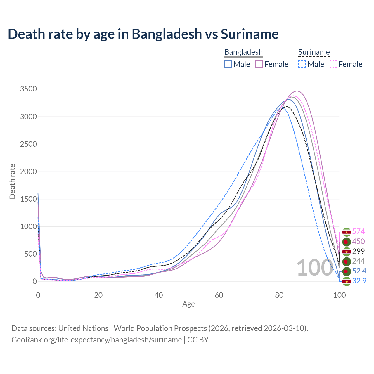 In Bangladesh, the most common age of death is 84, compared to 82 in Suriname. The median age of death is 79.7 in Bangladesh and 78 in Suriname, meaning only half of each cohort is expected to live past that age.