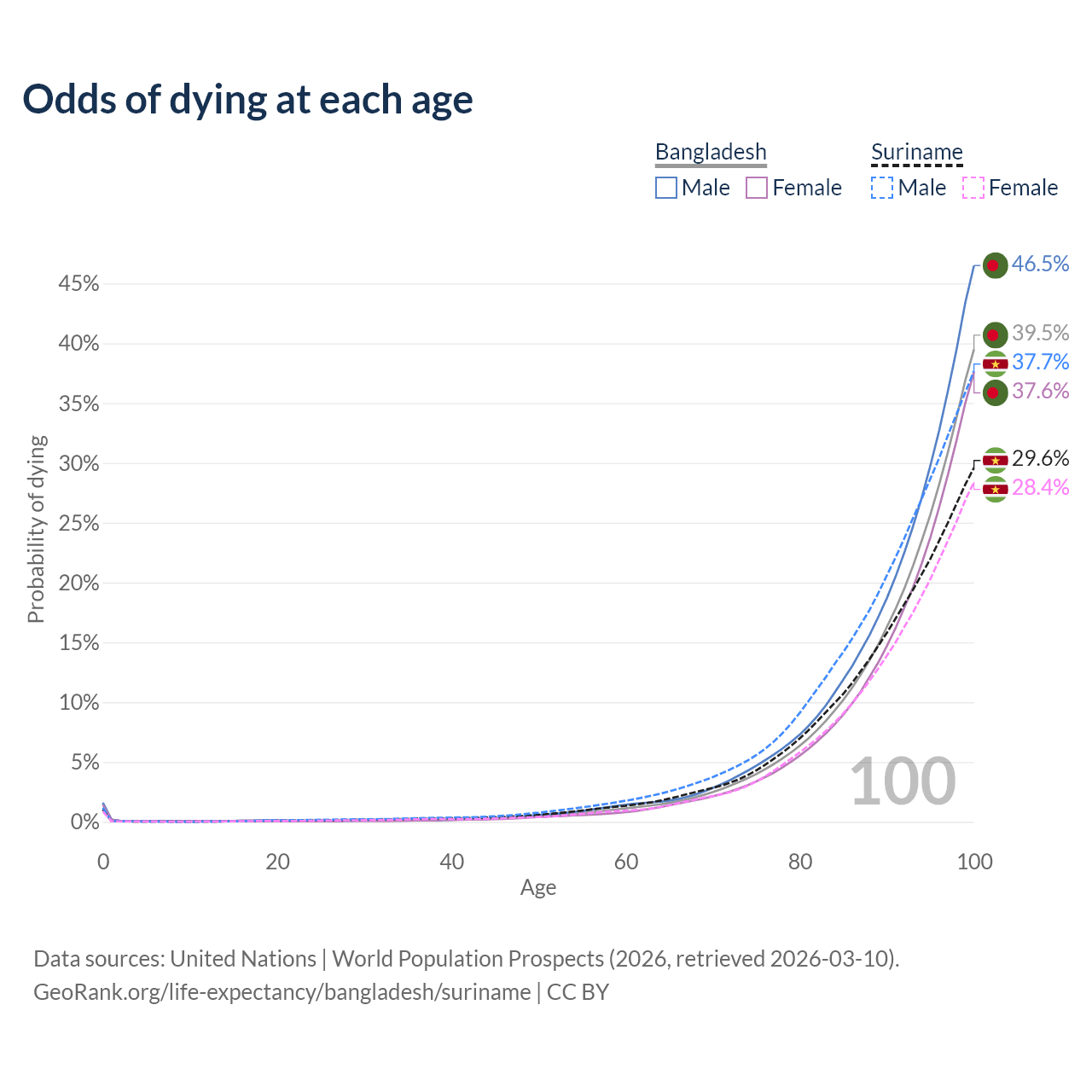 This life expectancy calculator shows the odds of living to 100, 95, 90, and below based on current age for both males and females in Bangladesh and Suriname, along with mean and median age of death. The calculations are based on the 2026 life tables (actuarial tables) from the UN World Population Prospects.