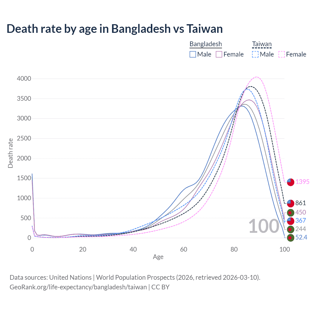 This life expectancy calculator shows the odds of living to 100, 95, 90, and below based on current age for both males and females in Bangladesh and Taiwan, along with mean and median age of death. The calculations are based on the 2026 life tables (actuarial tables) from the UN World Population Prospects.