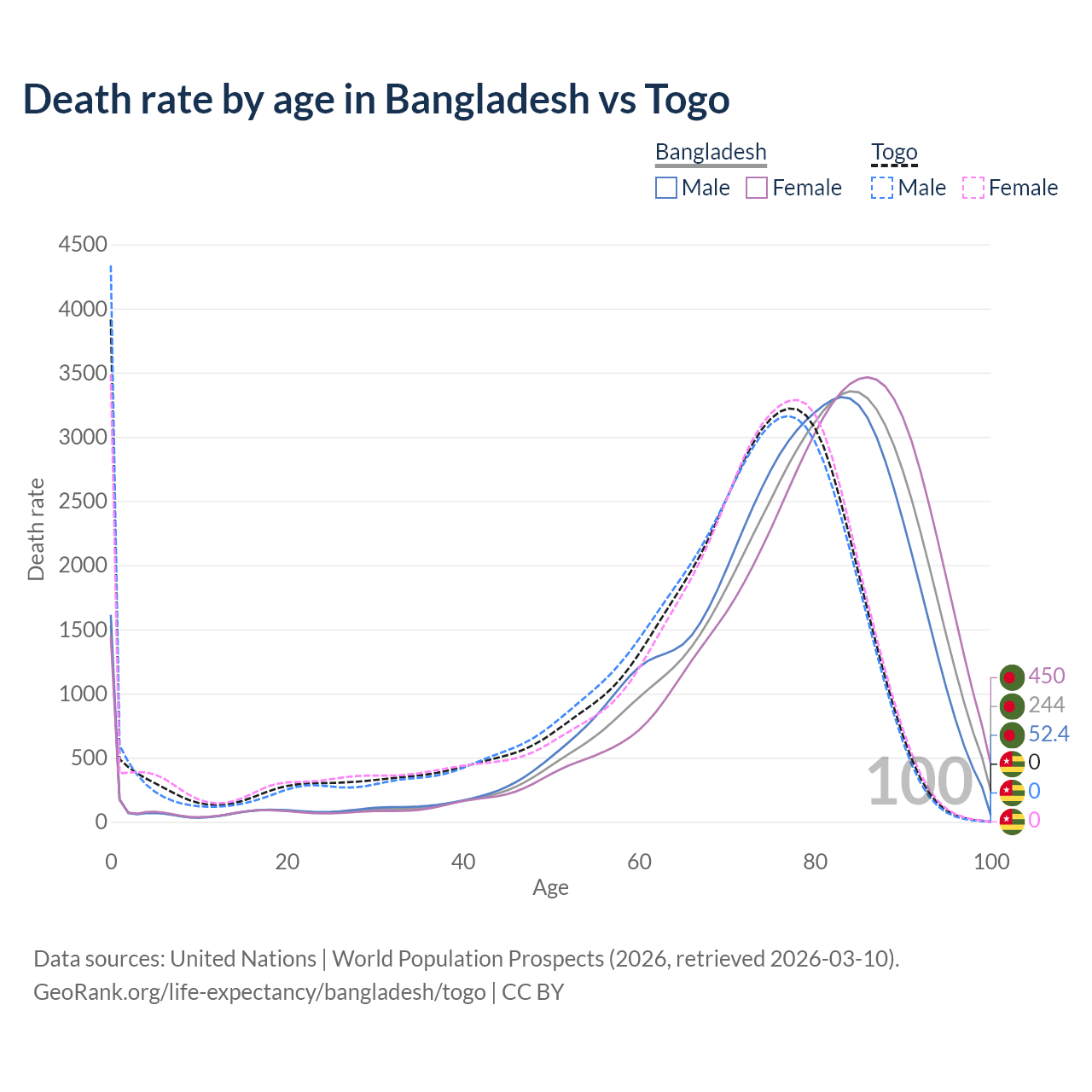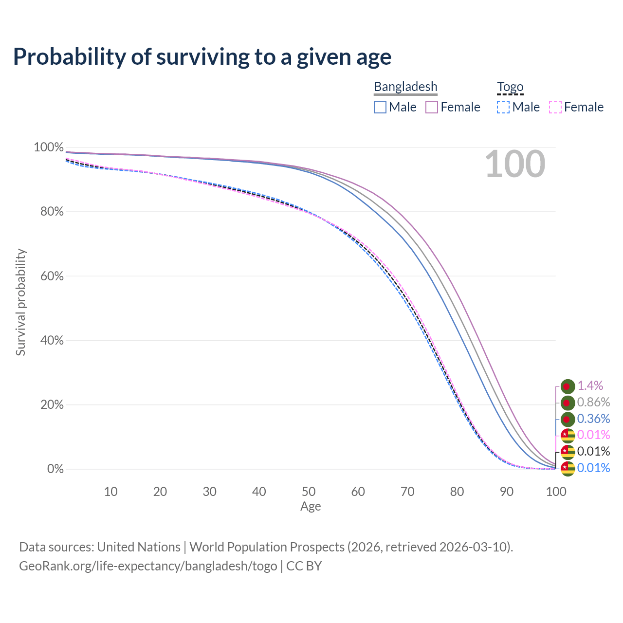 This life expectancy calculator shows the odds of living to 100, 95, 90, and below based on current age for both males and females in Bangladesh and Togo, along with mean and median age of death. The calculations are based on the 2026 life tables (actuarial tables) from the UN World Population Prospects.