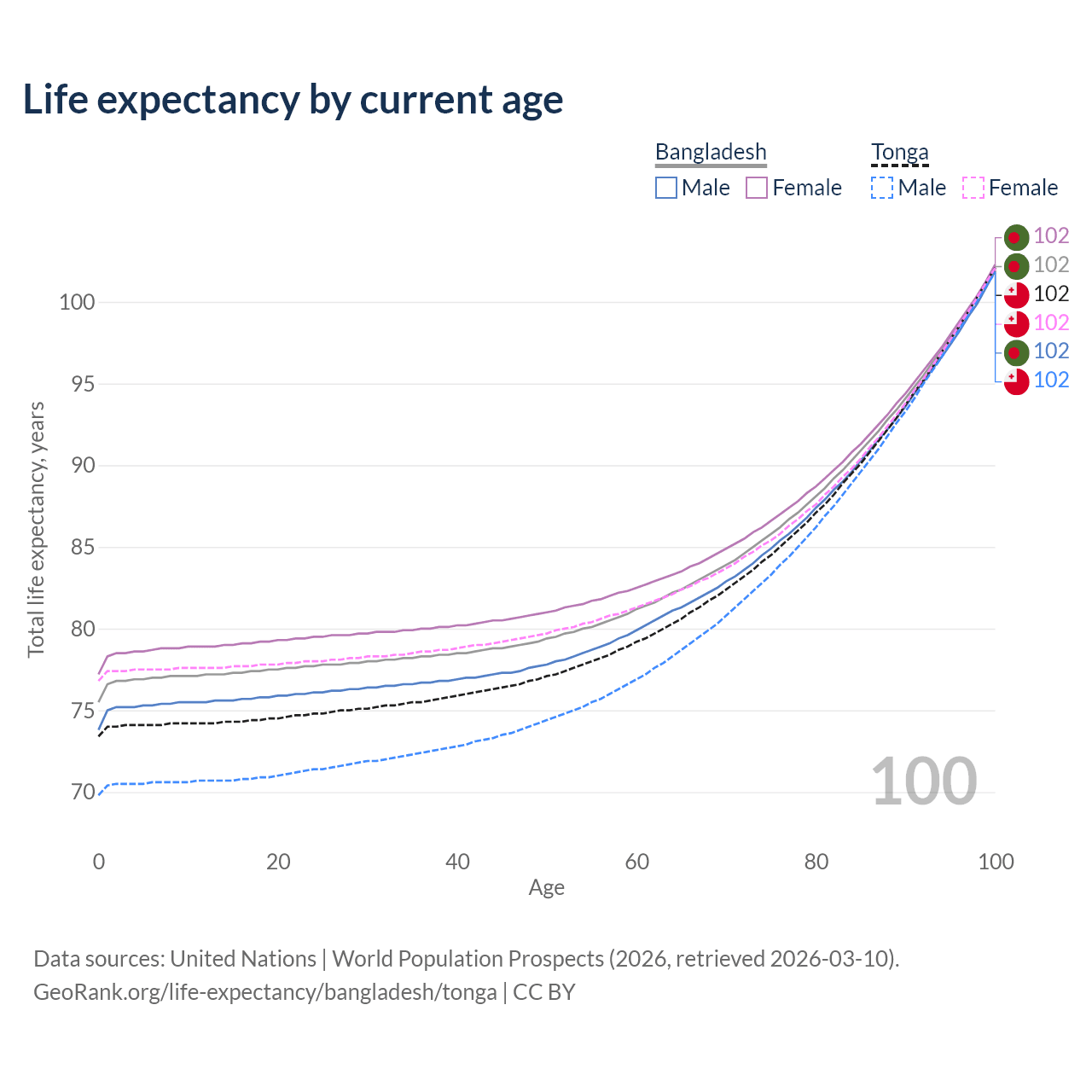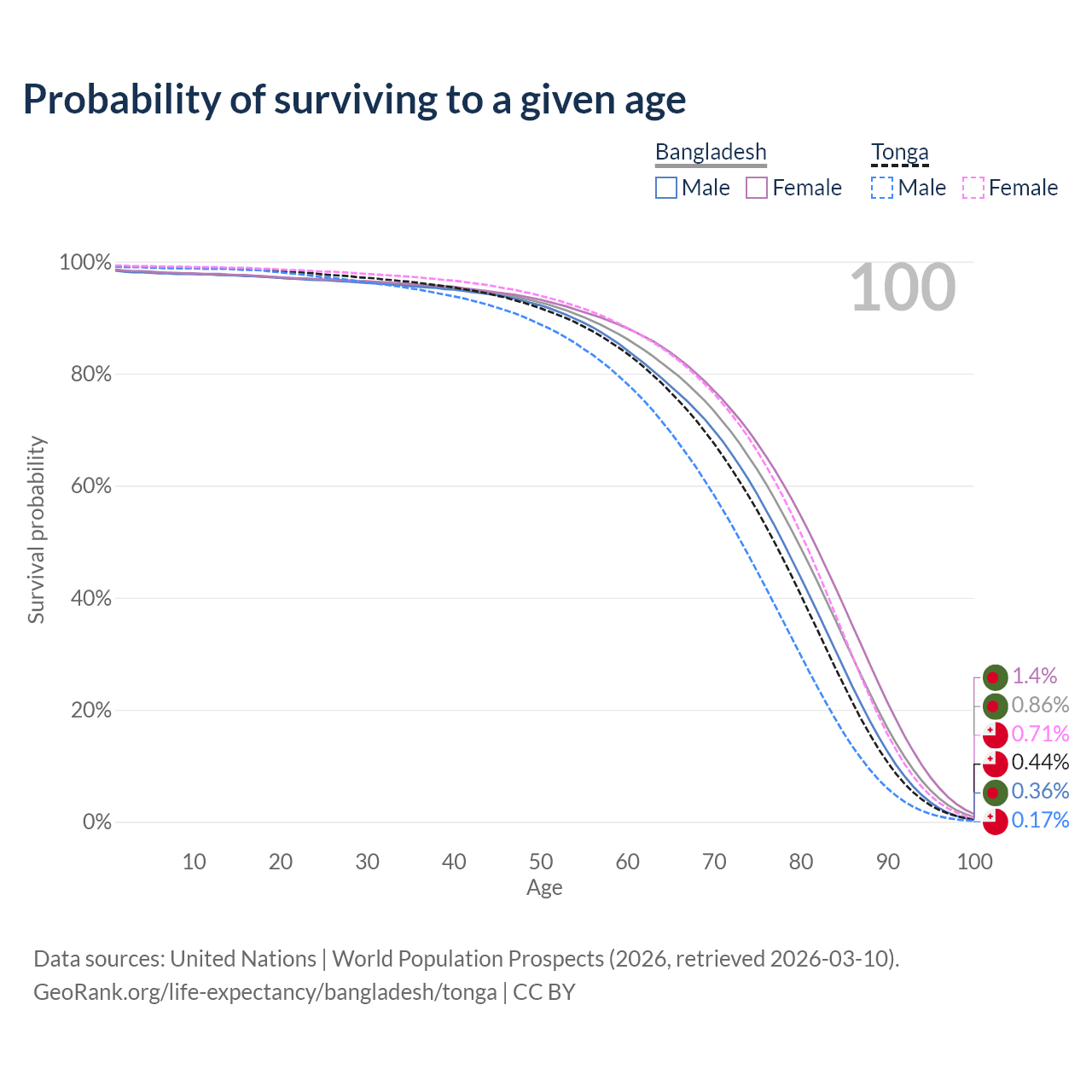 This life expectancy calculator shows the odds of living to 100, 95, 90, and below based on current age for both males and females in Bangladesh and Tonga, along with mean and median age of death. The calculations are based on the 2026 life tables (actuarial tables) from the UN World Population Prospects.