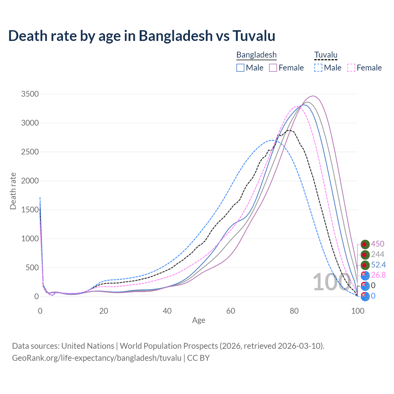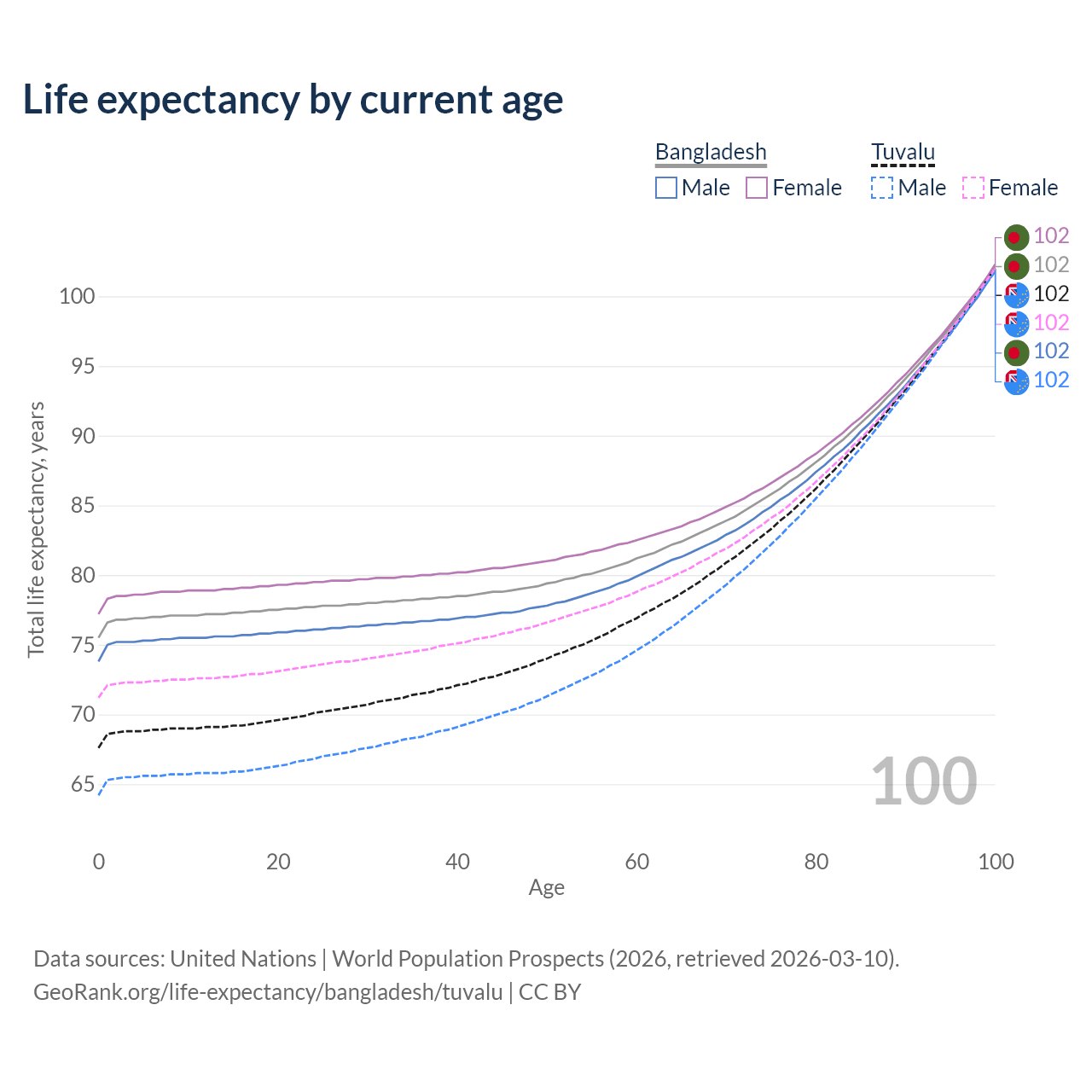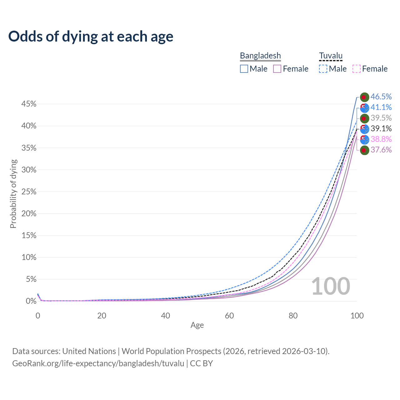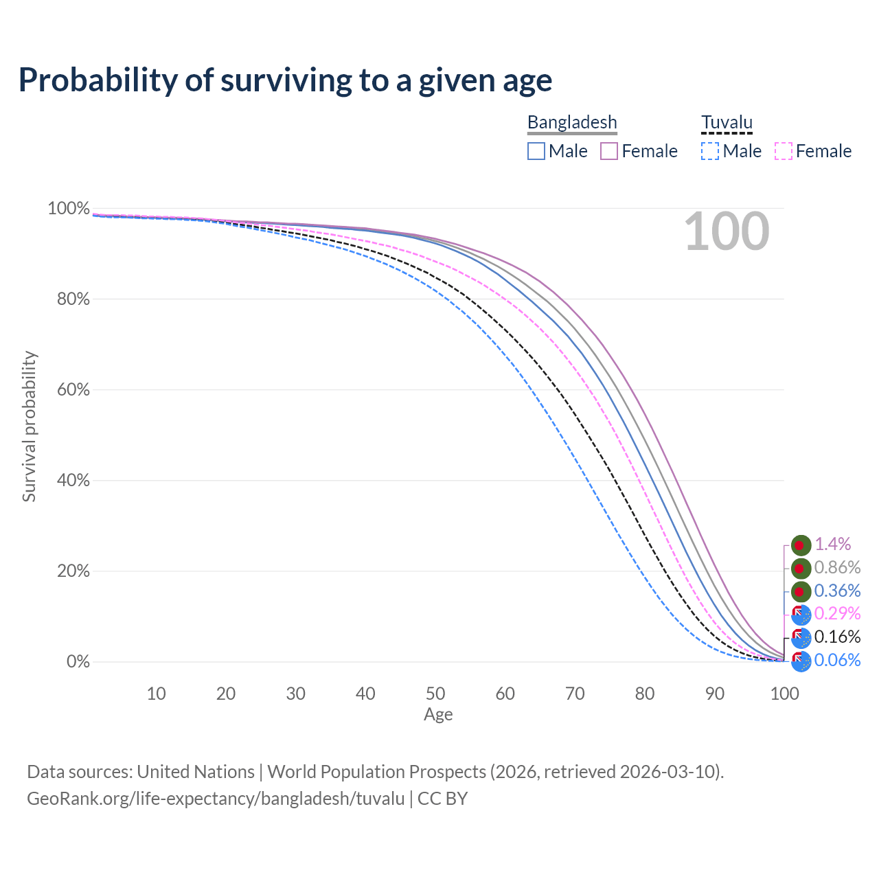 This life expectancy calculator shows the odds of living to 100, 95, 90, and below based on current age for both males and females in Bangladesh and Tuvalu, along with mean and median age of death. The calculations are based on the 2026 life tables (actuarial tables) from the UN World Population Prospects.