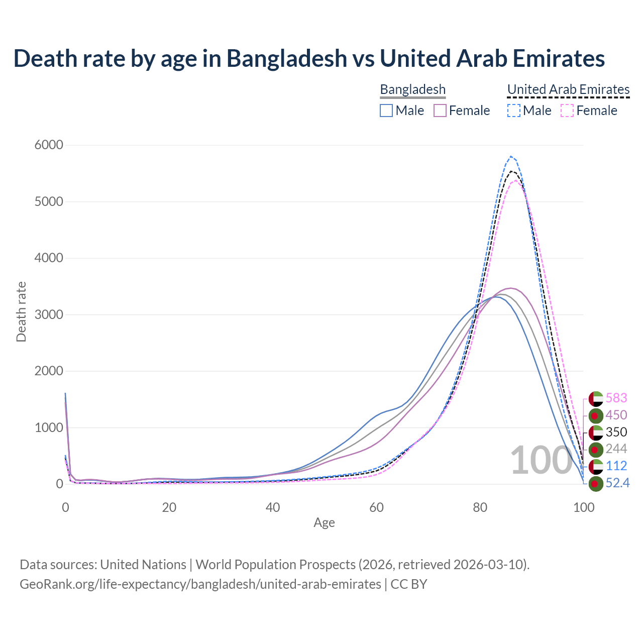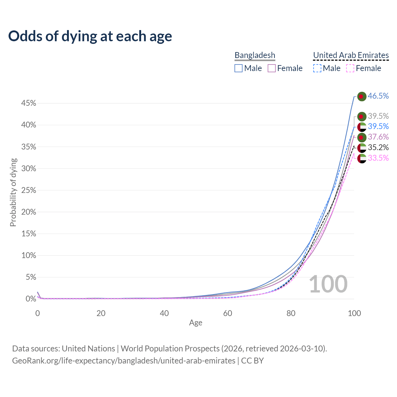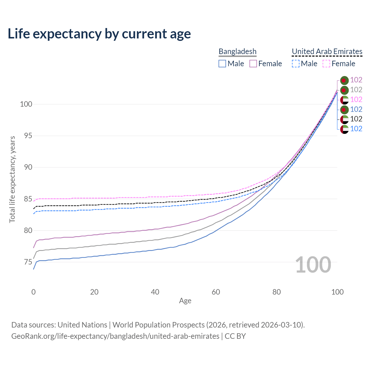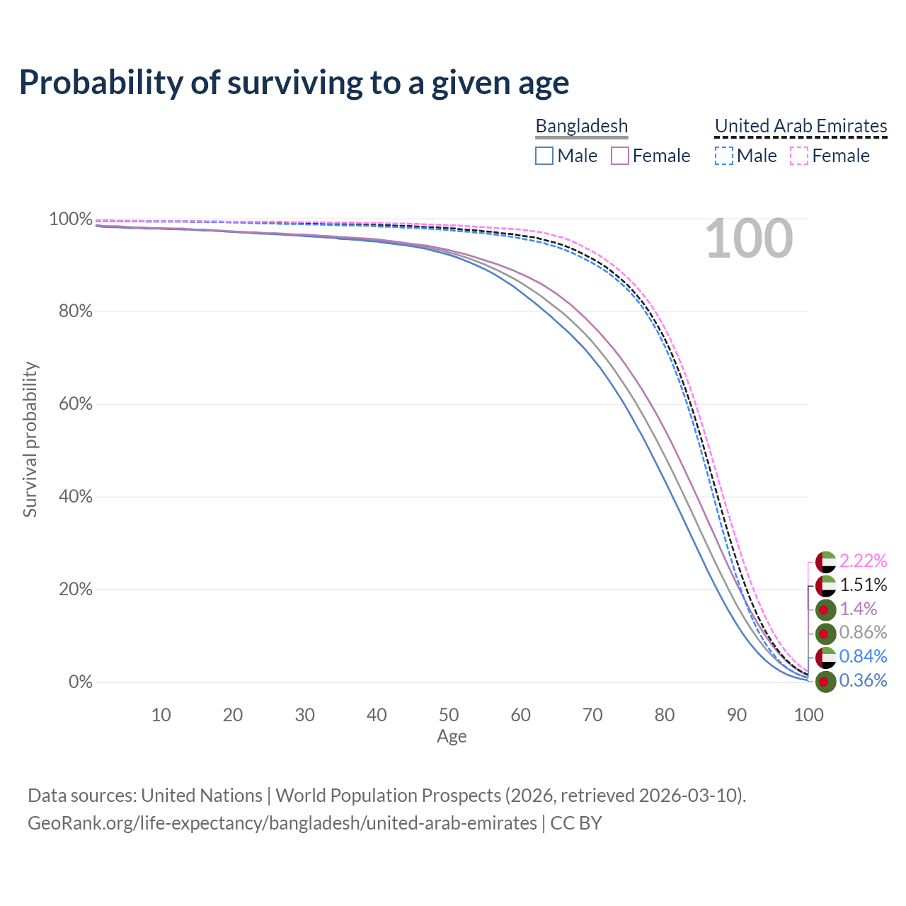 This life expectancy calculator shows the odds of living to 100, 95, 90, and below based on current age for both males and females in Bangladesh and the United Arab Emirates, along with mean and median age of death. The calculations are based on the 2026 life tables (actuarial tables) from the UN World Population Prospects.