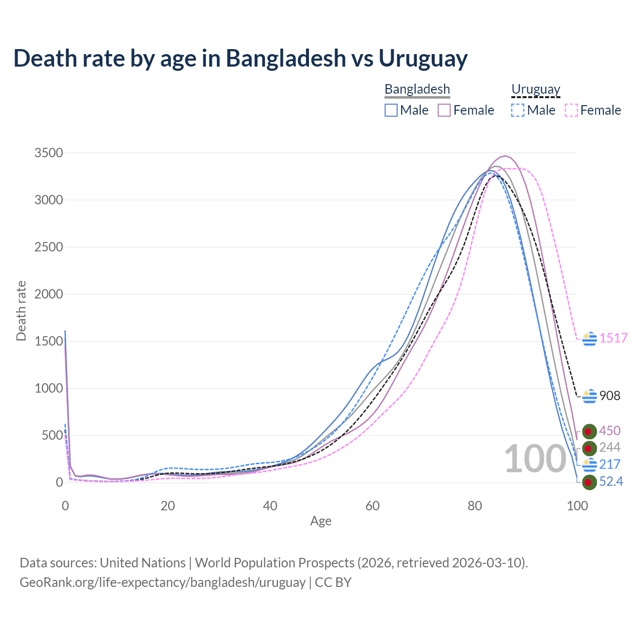 In Bangladesh, the most common age of death is 84, compared to 84 in Uruguay. The median age of death is 79.7 in Bangladesh and 81.8 in Uruguay, meaning only half of each cohort is expected to live past that age.
