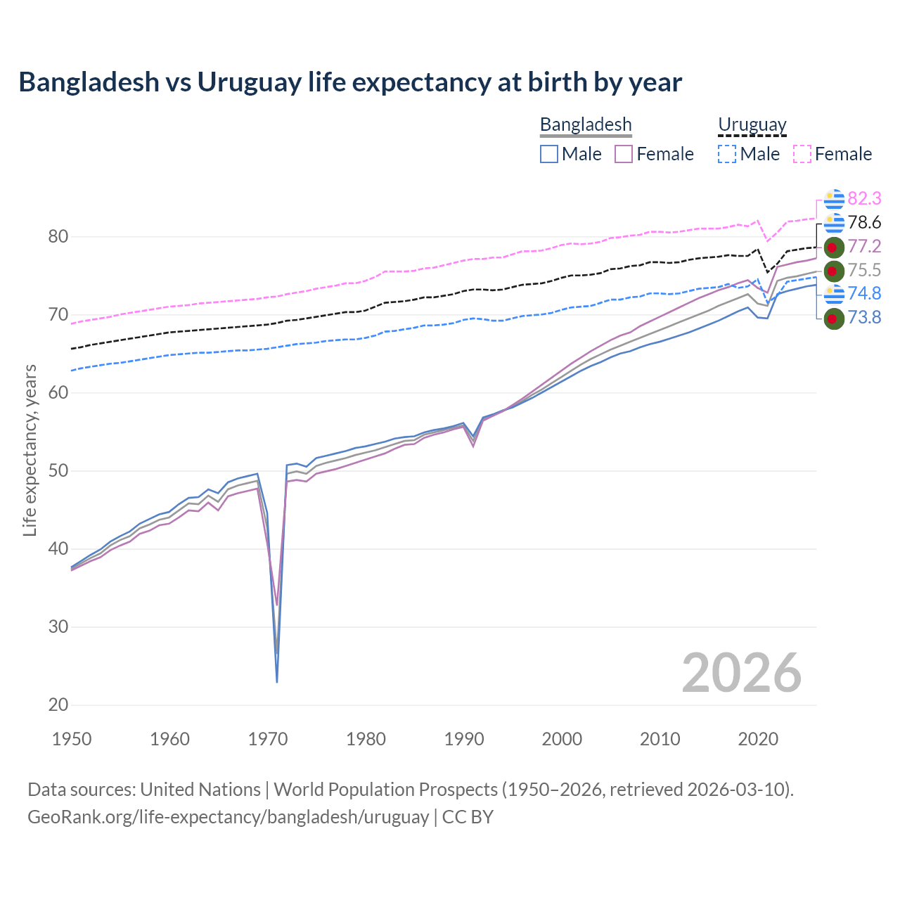 The average life expectancy at birth is 75.5 years in Bangladesh vs 78.6 in Uruguay. Bangladesh is ranked 89/197 by life expectancy, and Uruguay is 55/197. In Bangladesh, the life expectancy is 73.8 years for males and 77.2 years for females. In Uruguay, it's 74.8 years for males and 82.3 years for females.
