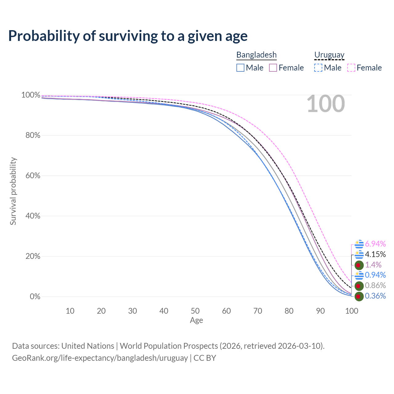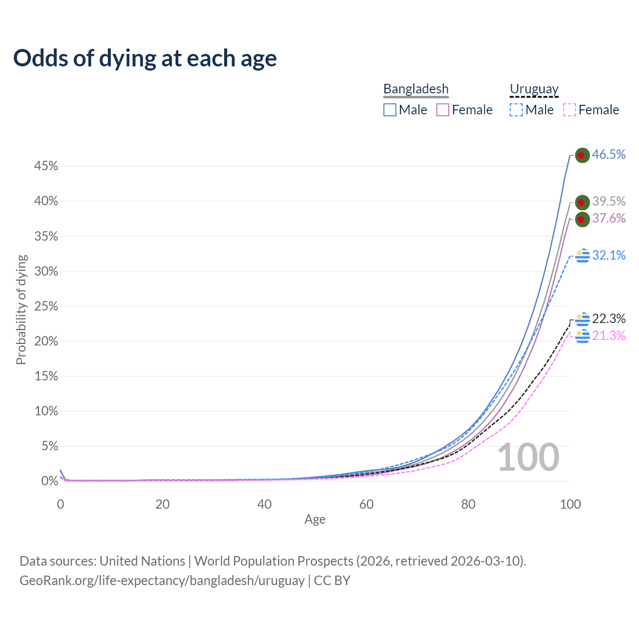 This life expectancy calculator shows the odds of living to 100, 95, 90, and below based on current age for both males and females in Bangladesh and Uruguay, along with mean and median age of death. The calculations are based on the 2026 life tables (actuarial tables) from the UN World Population Prospects.