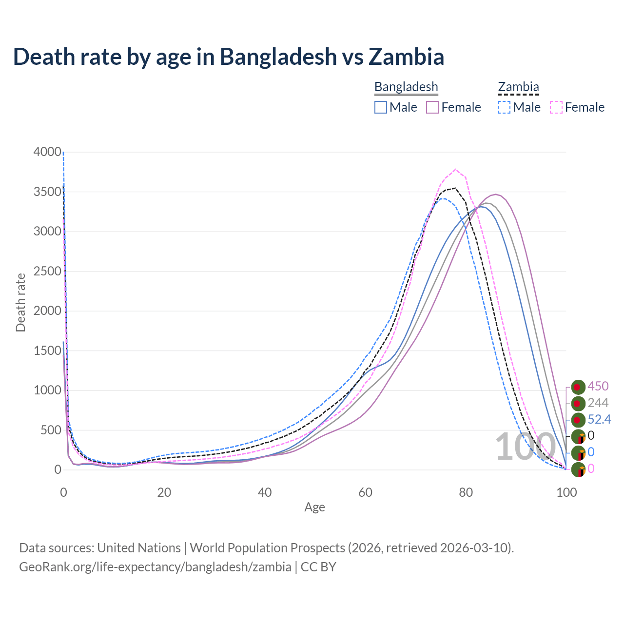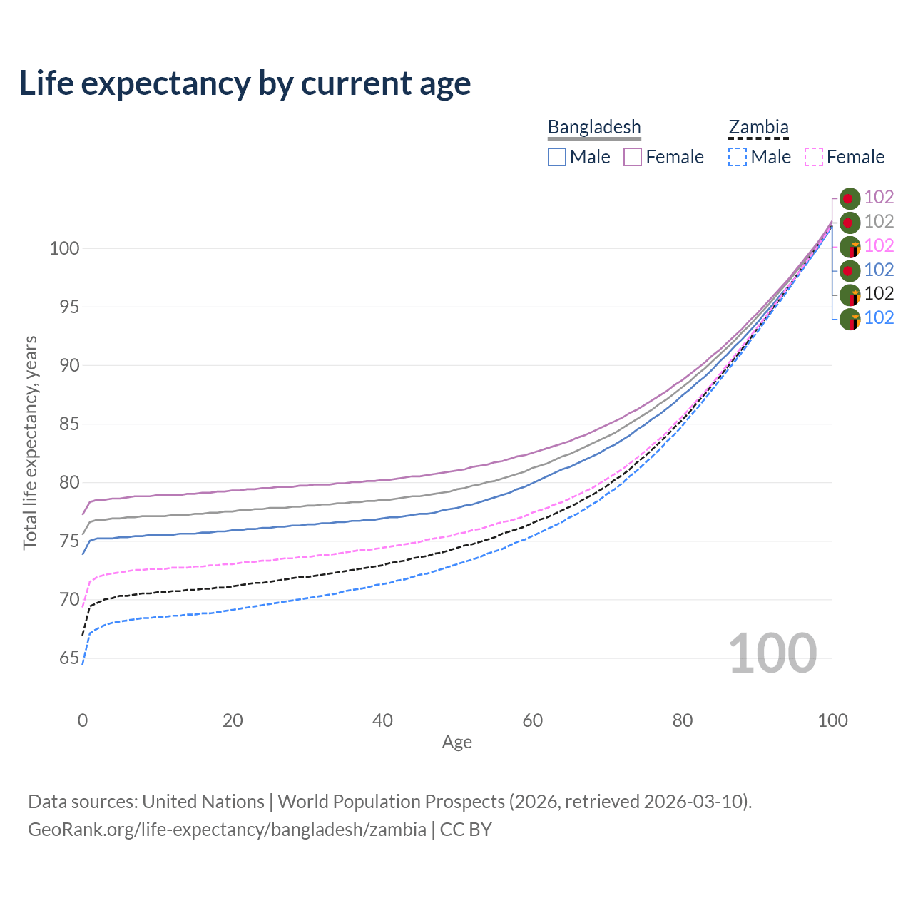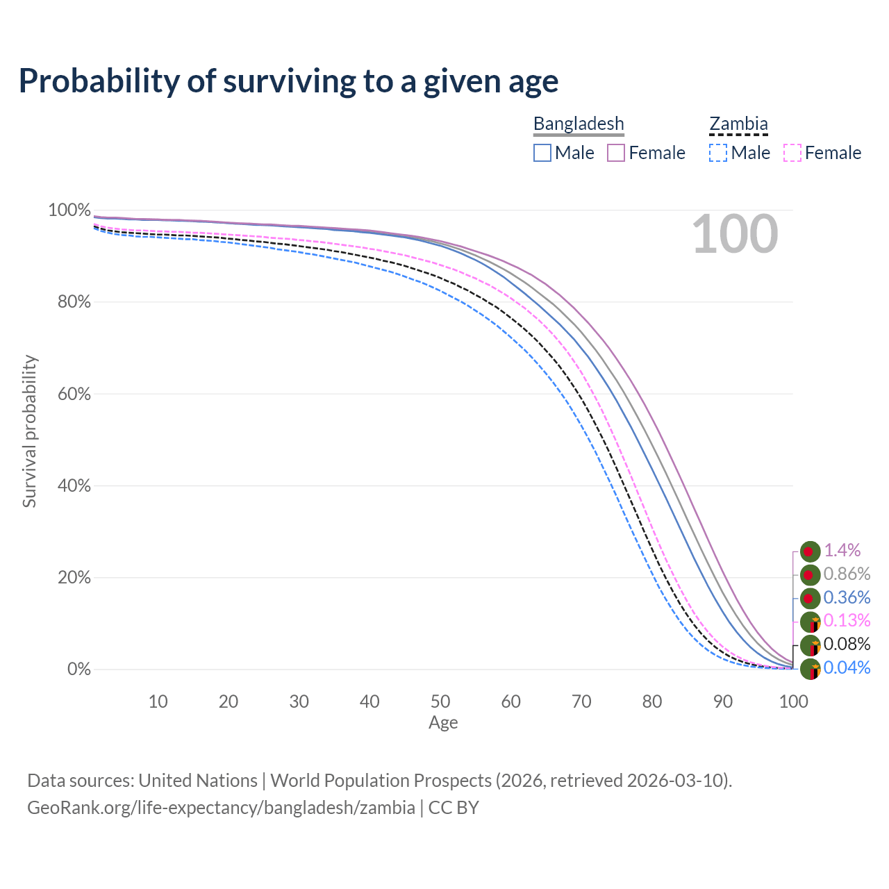 This life expectancy calculator shows the odds of living to 100, 95, 90, and below based on current age for both males and females in Bangladesh and Zambia, along with mean and median age of death. The calculations are based on the 2026 life tables (actuarial tables) from the UN World Population Prospects.