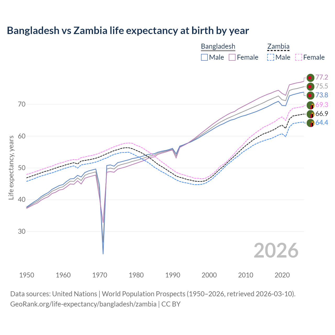 The average life expectancy at birth is 75.5 years in Bangladesh vs 66.9 in Zambia. Bangladesh is ranked 89/197 by life expectancy, and Zambia is 161/197. In Bangladesh, the life expectancy is 73.8 years for males and 77.2 years for females. In Zambia, it's 64.4 years for males and 69.3 years for females.