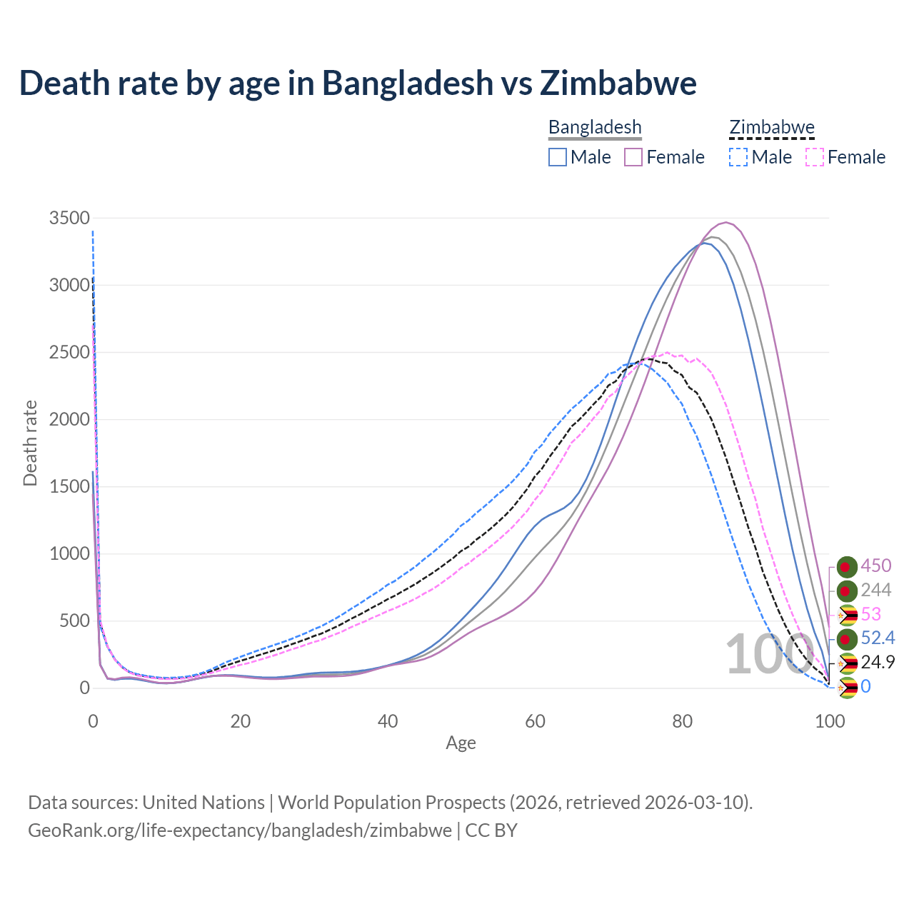In Bangladesh, the most common age of death is 84, compared to 0 in Zimbabwe. The median age of death is 79.7 in Bangladesh and 68.8 in Zimbabwe, meaning only half of each cohort is expected to live past that age.