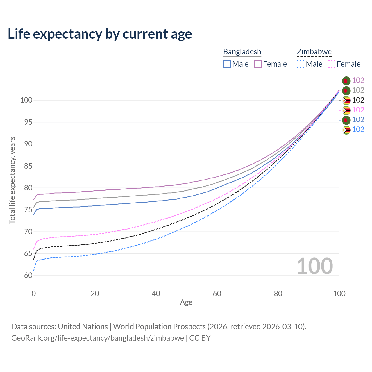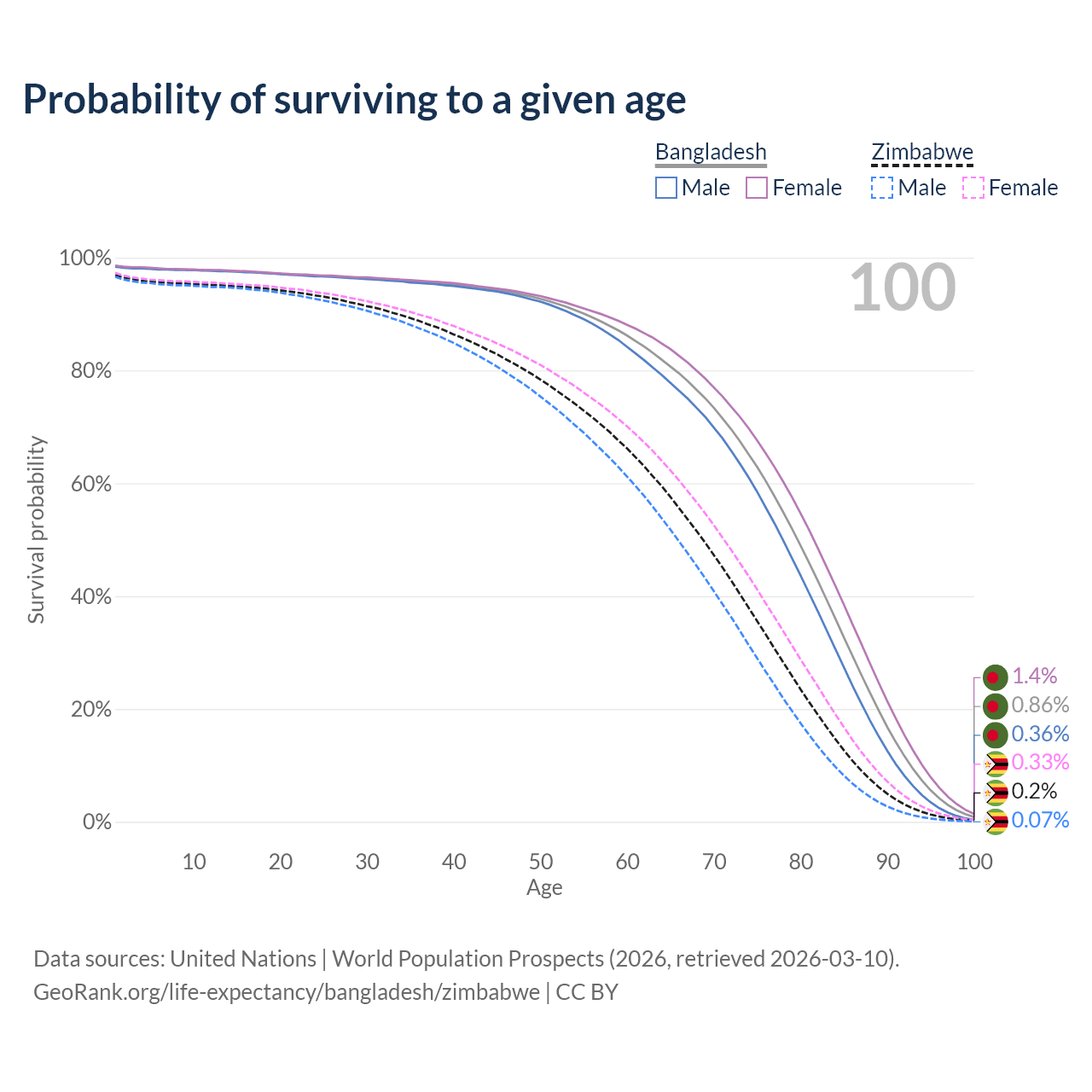 This life expectancy calculator shows the odds of living to 100, 95, 90, and below based on current age for both males and females in Bangladesh and Zimbabwe, along with mean and median age of death. The calculations are based on the 2026 life tables (actuarial tables) from the UN World Population Prospects.