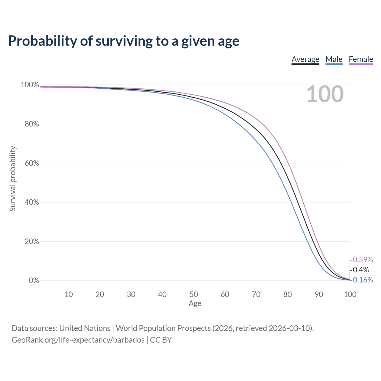 This life expectancy calculator shows the odds of living to 100, 95, 90, and below based on current age for both males and females in Barbados, along with mean and median age of death. The calculations are based on the 2026 life tables (actuarial tables) from the UN World Population Prospects.