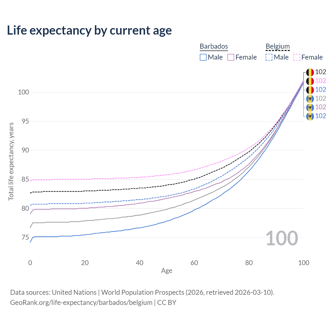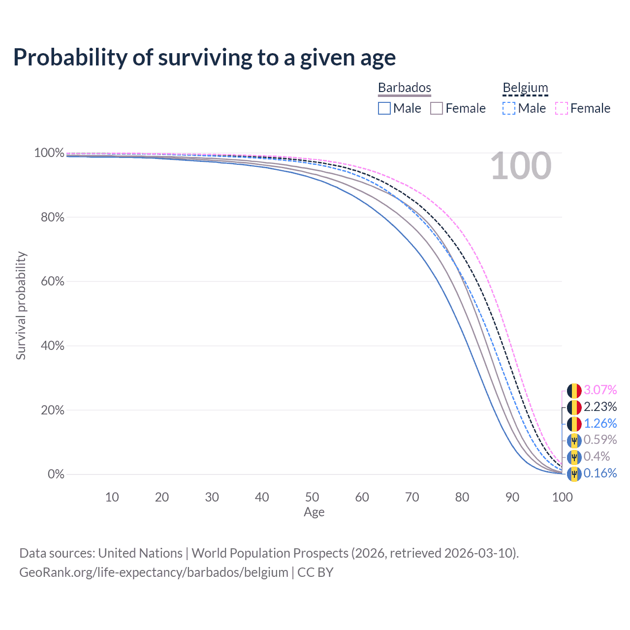 This life expectancy calculator shows the odds of living to 100, 95, 90, and below based on current age for both males and females in Barbados and Belgium, along with mean and median age of death. The calculations are based on the 2026 life tables (actuarial tables) from the UN World Population Prospects.