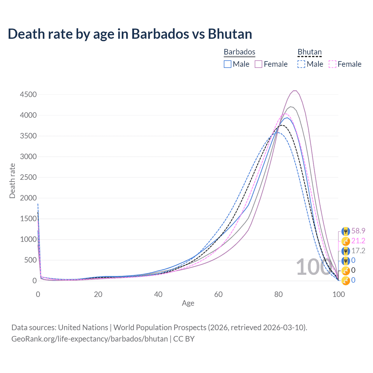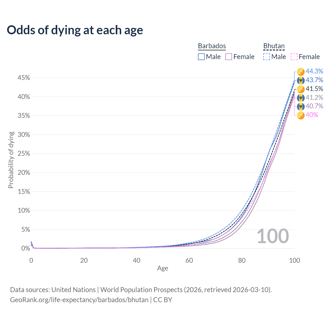 This life expectancy calculator shows the odds of living to 100, 95, 90, and below based on current age for both males and females in Barbados and Bhutan, along with mean and median age of death. The calculations are based on the 2026 life tables (actuarial tables) from the UN World Population Prospects.