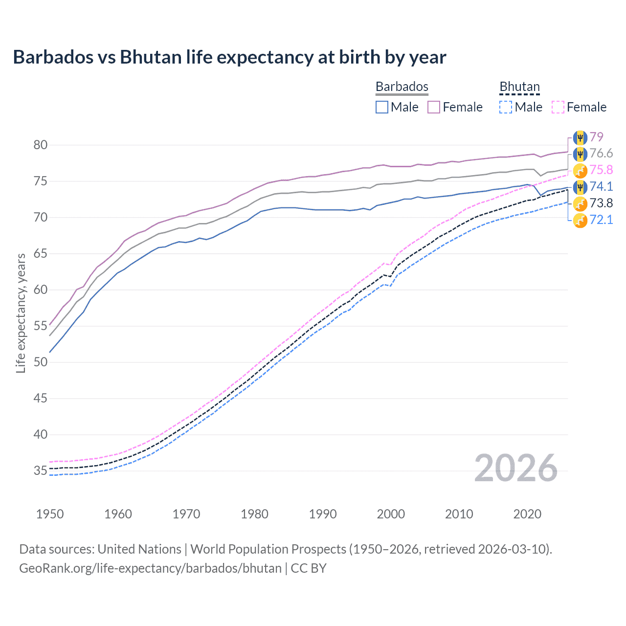 GeoRank.org/life-expectancy/barbados/bhutan | CC BY