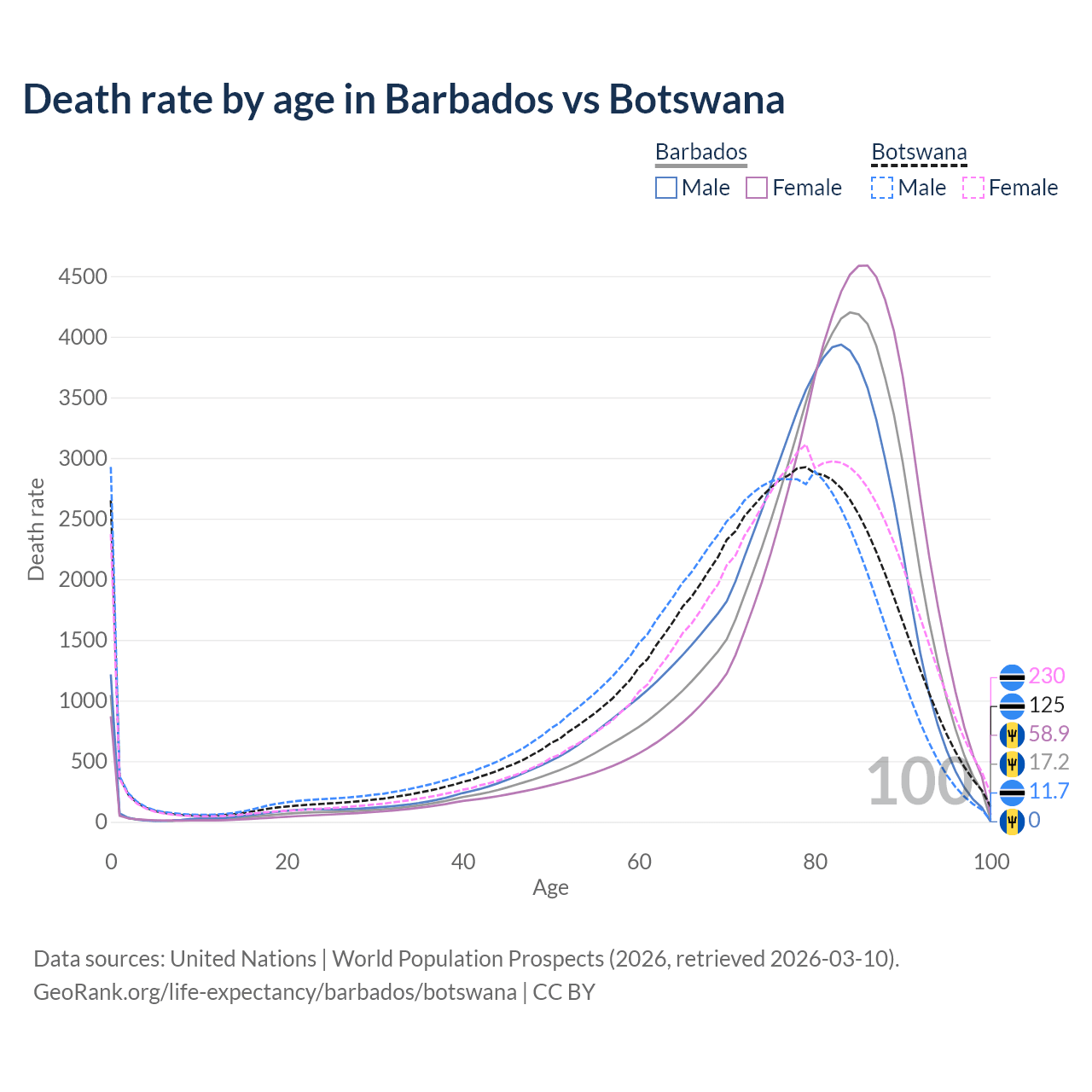 In Barbados, the most common age of death is 84, compared to 79 in Botswana. The median age of death is 80.8 in Barbados and 74.4 in Botswana, meaning only half of each cohort is expected to live past that age.