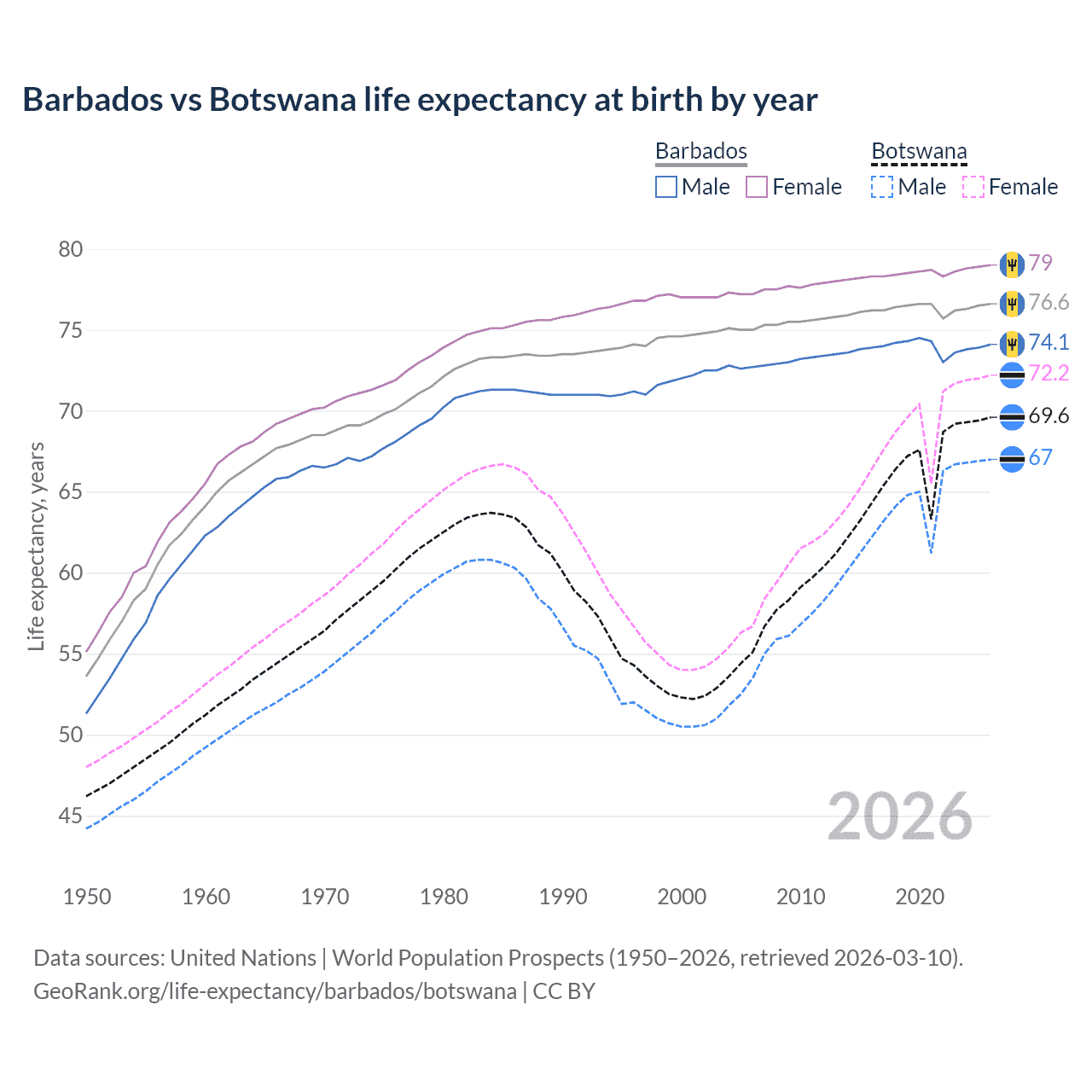 The average life expectancy at birth is 76.6 years in Barbados vs 69.6 in Botswana. Barbados is ranked 77/197 by life expectancy, and Botswana is 141/197. In Barbados, the life expectancy is 74.1 years for males and 79 years for females. In Botswana, it's 67 years for males and 72.2 years for females.