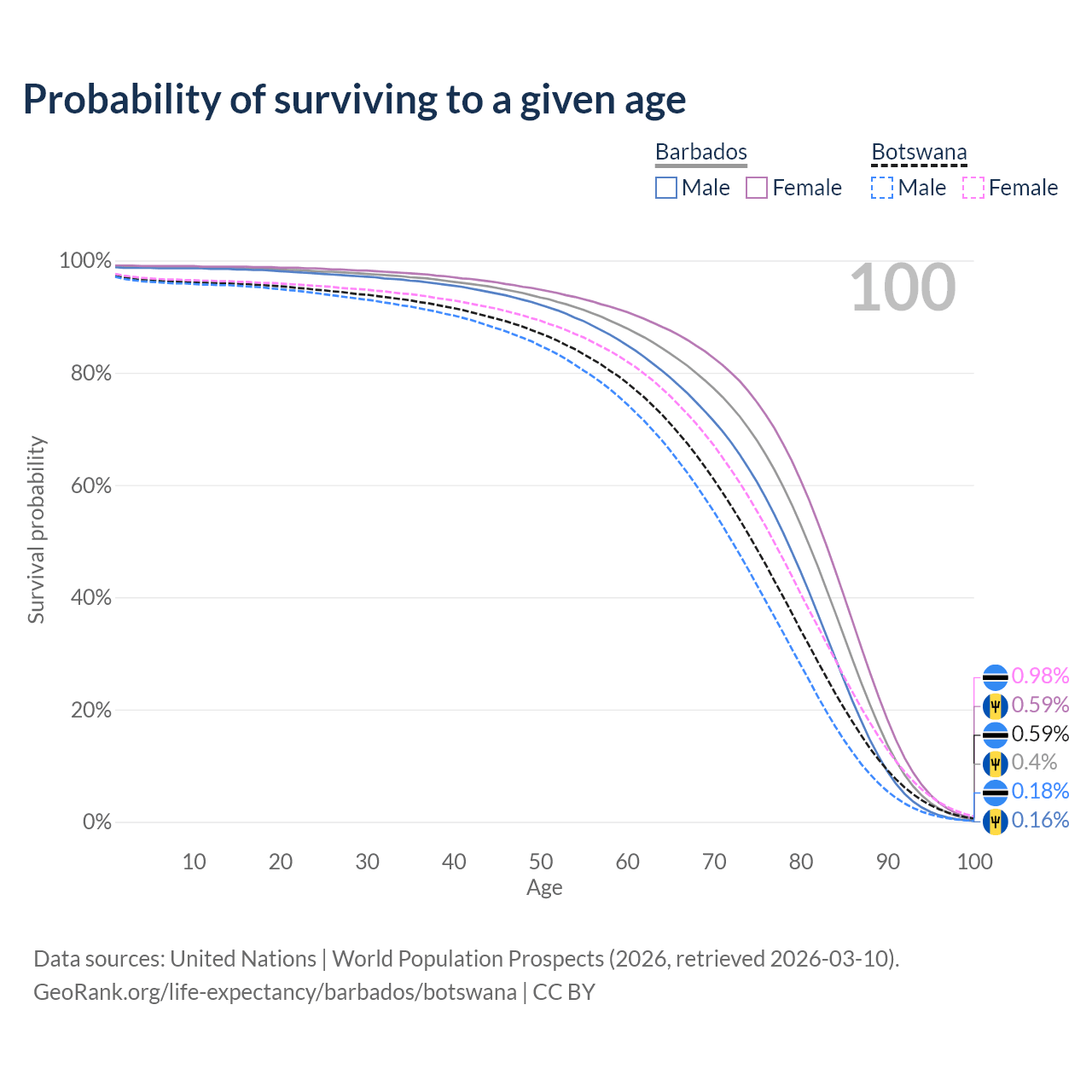 This life expectancy calculator shows the odds of living to 100, 95, 90, and below based on current age for both males and females in Barbados and Botswana, along with mean and median age of death. The calculations are based on the 2026 life tables (actuarial tables) from the UN World Population Prospects.