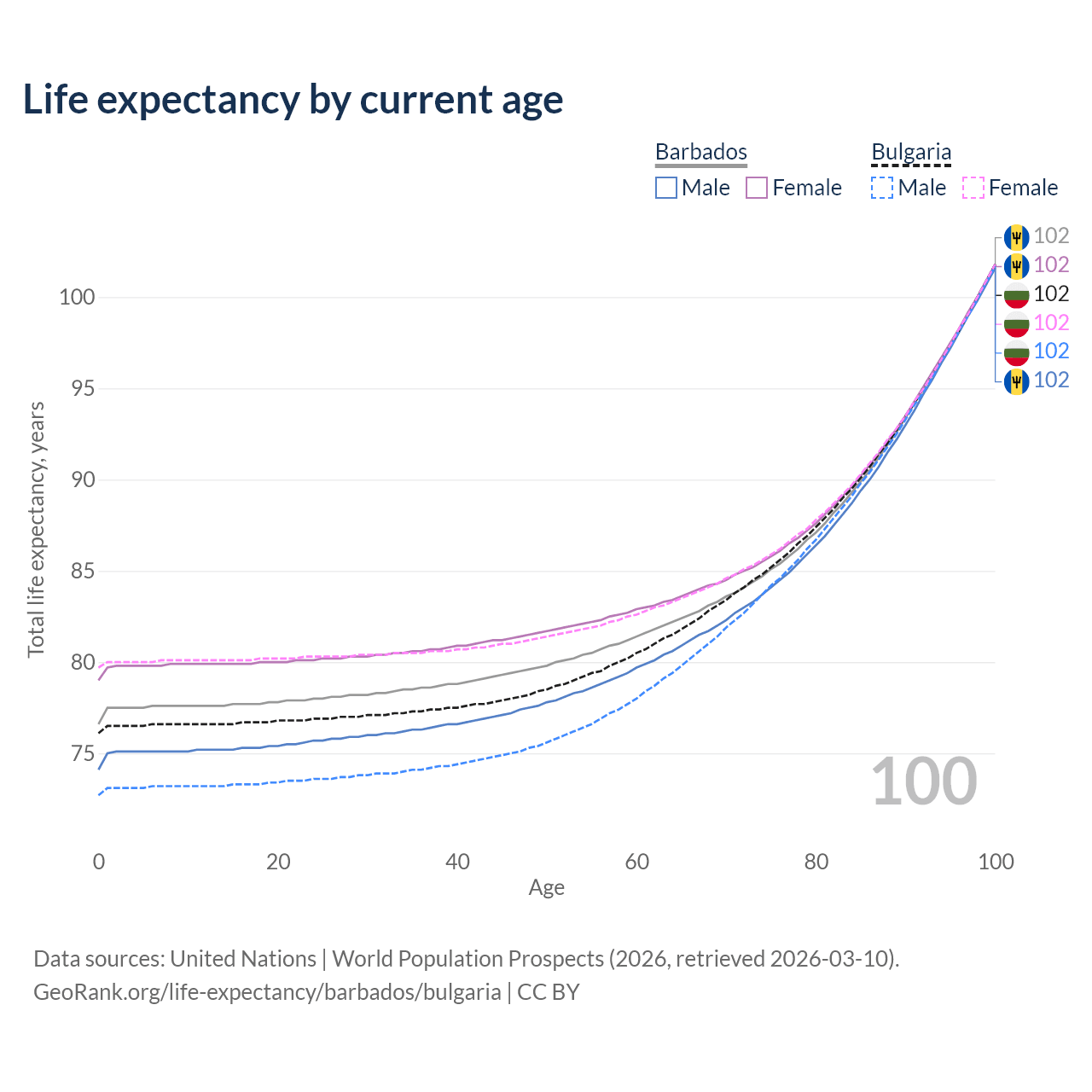 This life expectancy calculator shows the odds of living to 100, 95, 90, and below based on current age for both males and females in Barbados and Bulgaria, along with mean and median age of death. The calculations are based on the 2026 life tables (actuarial tables) from the UN World Population Prospects.