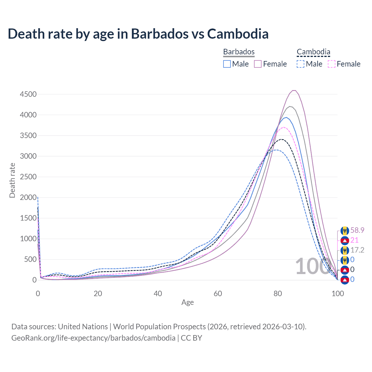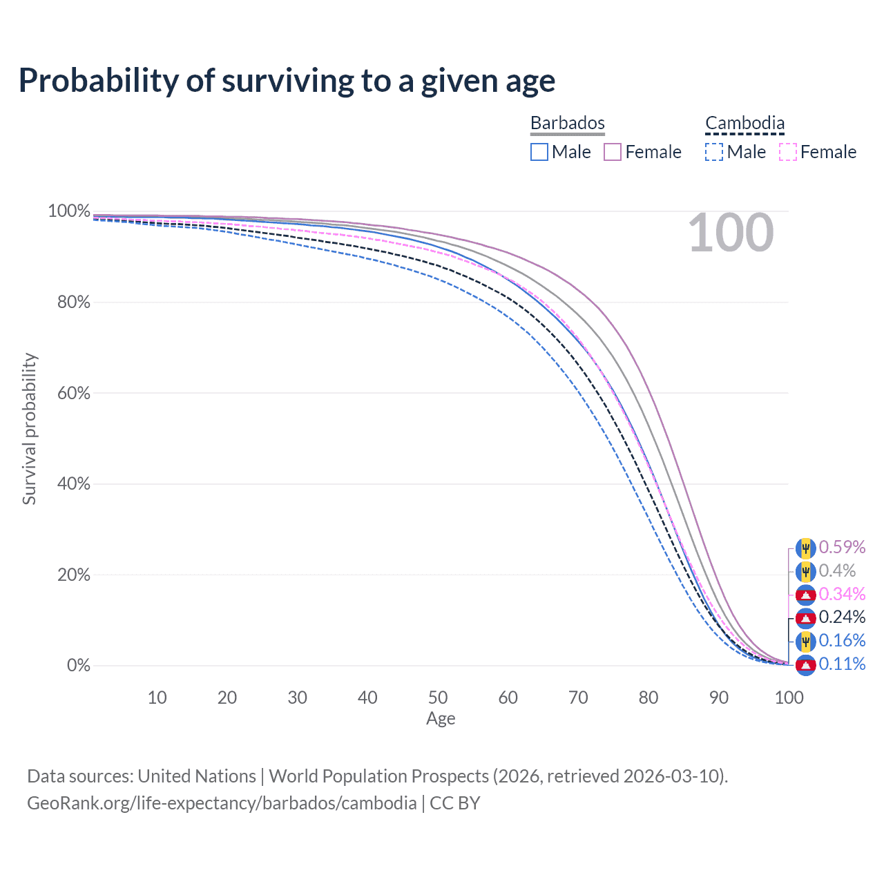 This life expectancy calculator shows the odds of living to 100, 95, 90, and below based on current age for both males and females in Barbados and Cambodia, along with mean and median age of death. The calculations are based on the 2026 life tables (actuarial tables) from the UN World Population Prospects.
