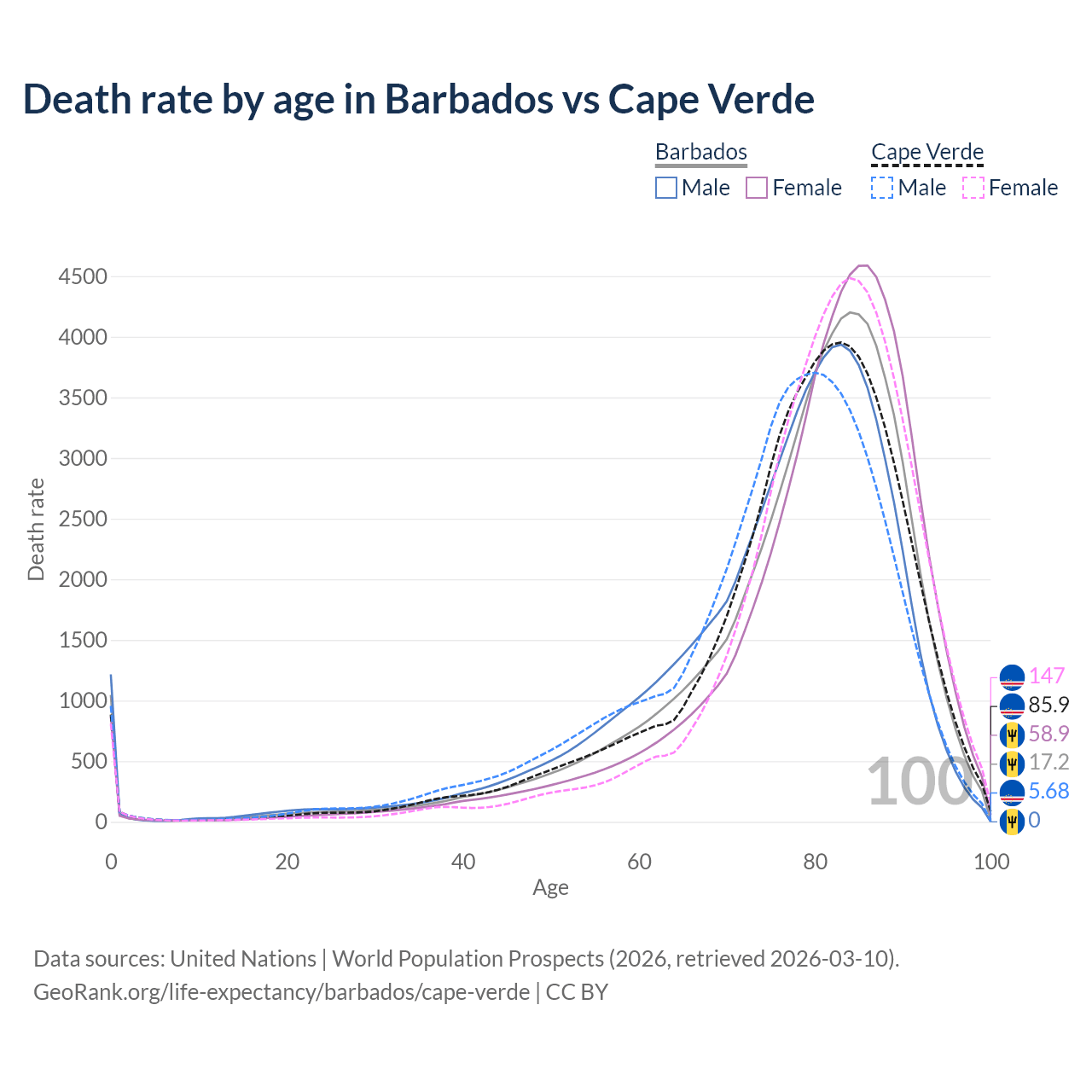 In Barbados, the most common age of death is 84, compared to 83 in Cape Verde. The median age of death is 80.8 in Barbados and 80.1 in Cape Verde, meaning only half of each cohort is expected to live past that age.
