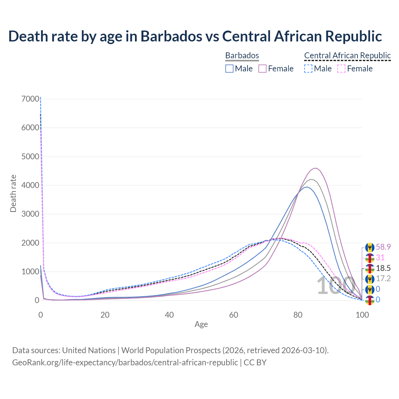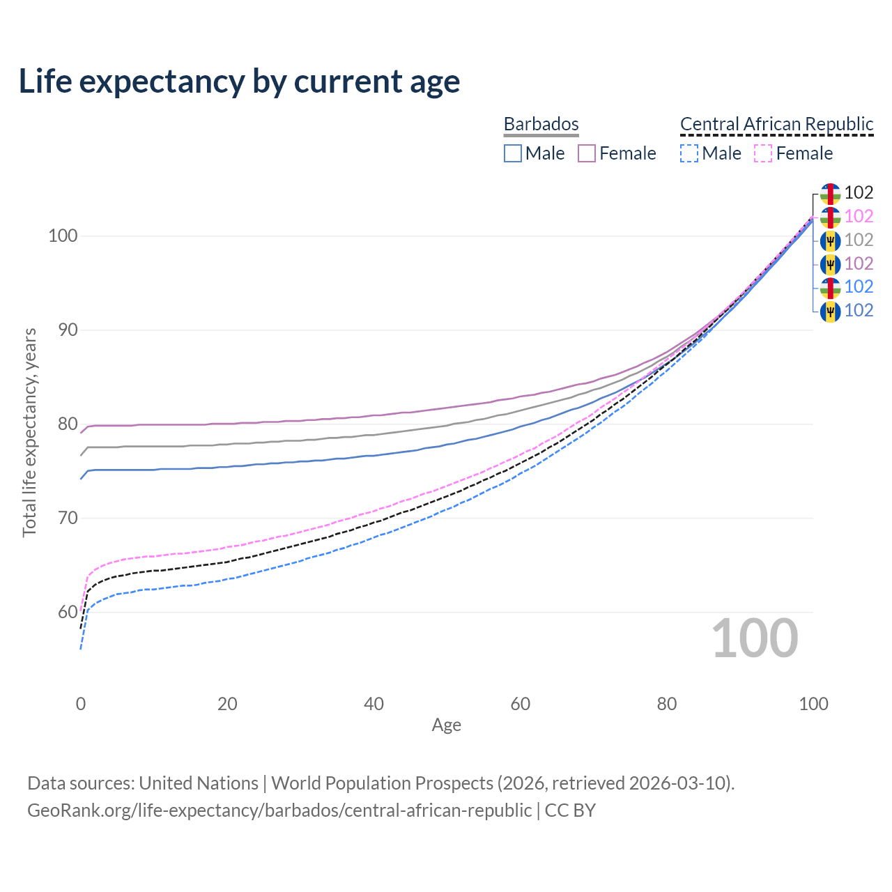 This life expectancy calculator shows the odds of living to 100, 95, 90, and below based on current age for both males and females in Barbados and the Central African Republic, along with mean and median age of death. The calculations are based on the 2026 life tables (actuarial tables) from the UN World Population Prospects.
