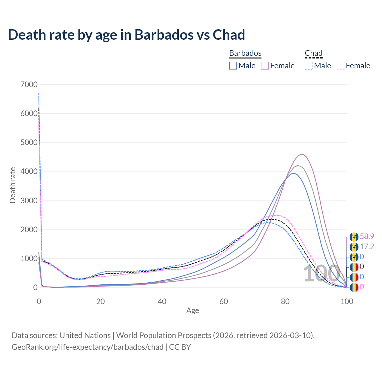 The average life expectancy at birth is 76.6 years in Barbados vs 55.6 in Chad. Barbados is ranked 77/197 by life expectancy, and Chad is 196/197. In Barbados, the life expectancy is 74.1 years for males and 79 years for females. In Chad, it's 53.7 years for males and 57.6 years for females.