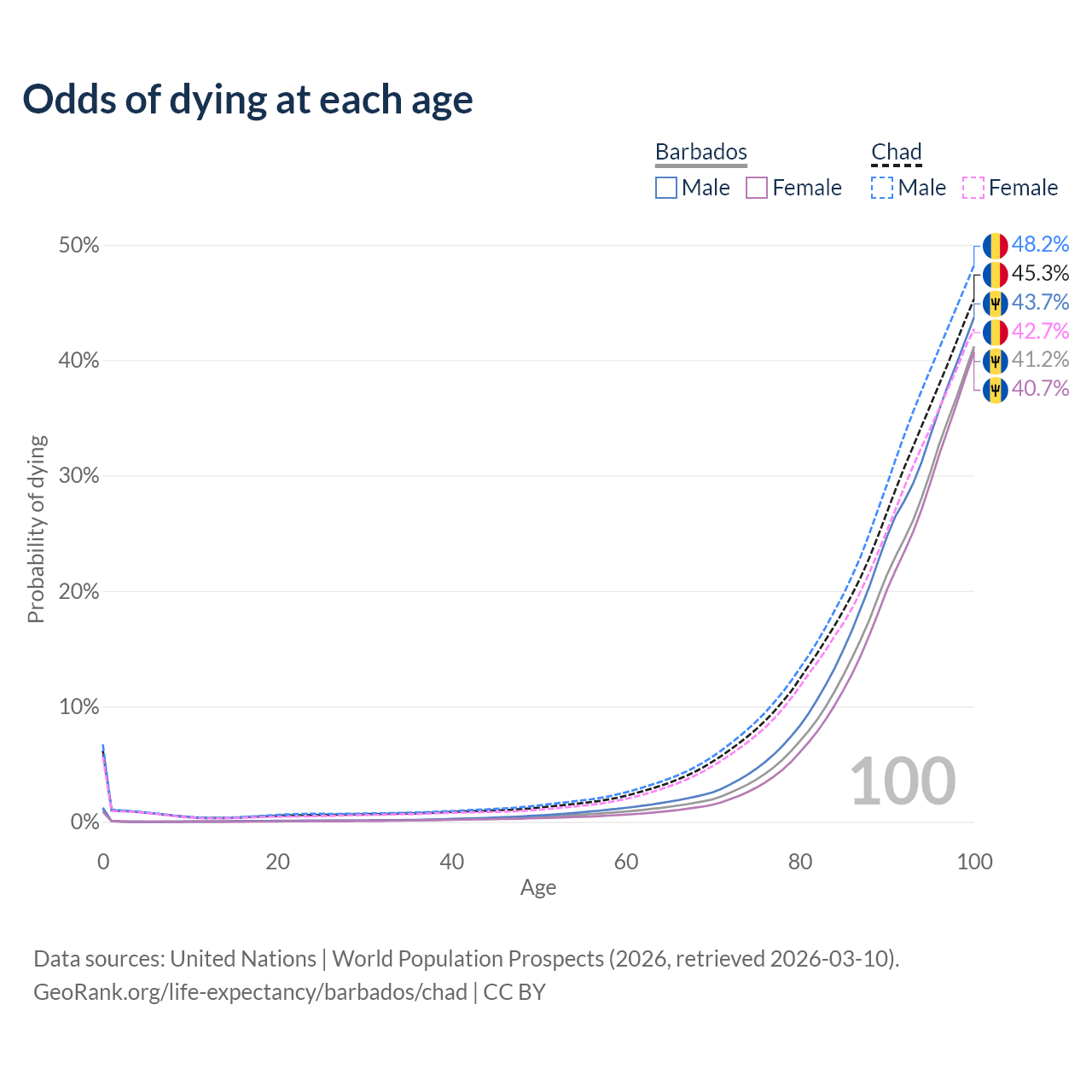 This life expectancy calculator shows the odds of living to 100, 95, 90, and below based on current age for both males and females in Barbados and Chad, along with mean and median age of death. The calculations are based on the 2026 life tables (actuarial tables) from the UN World Population Prospects.