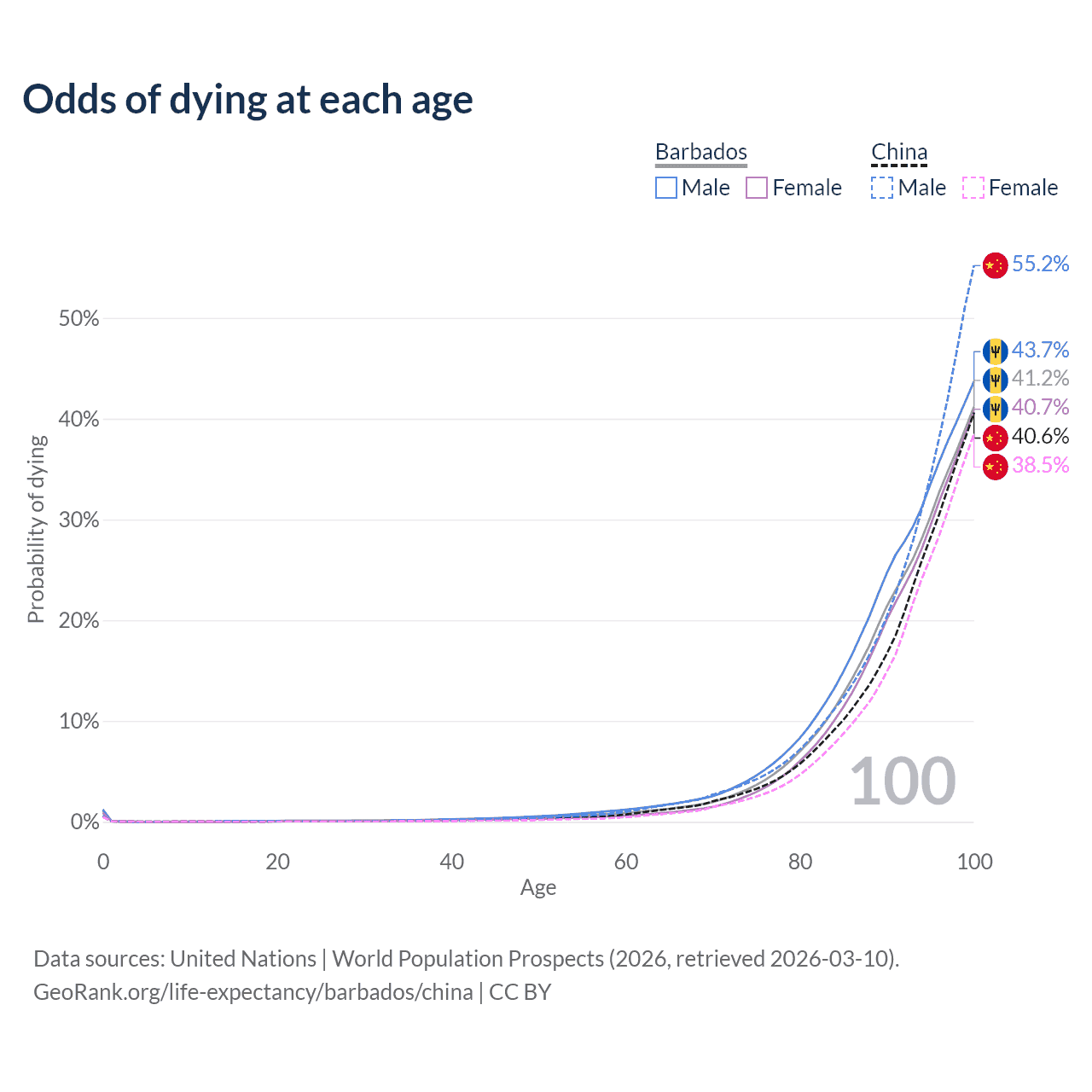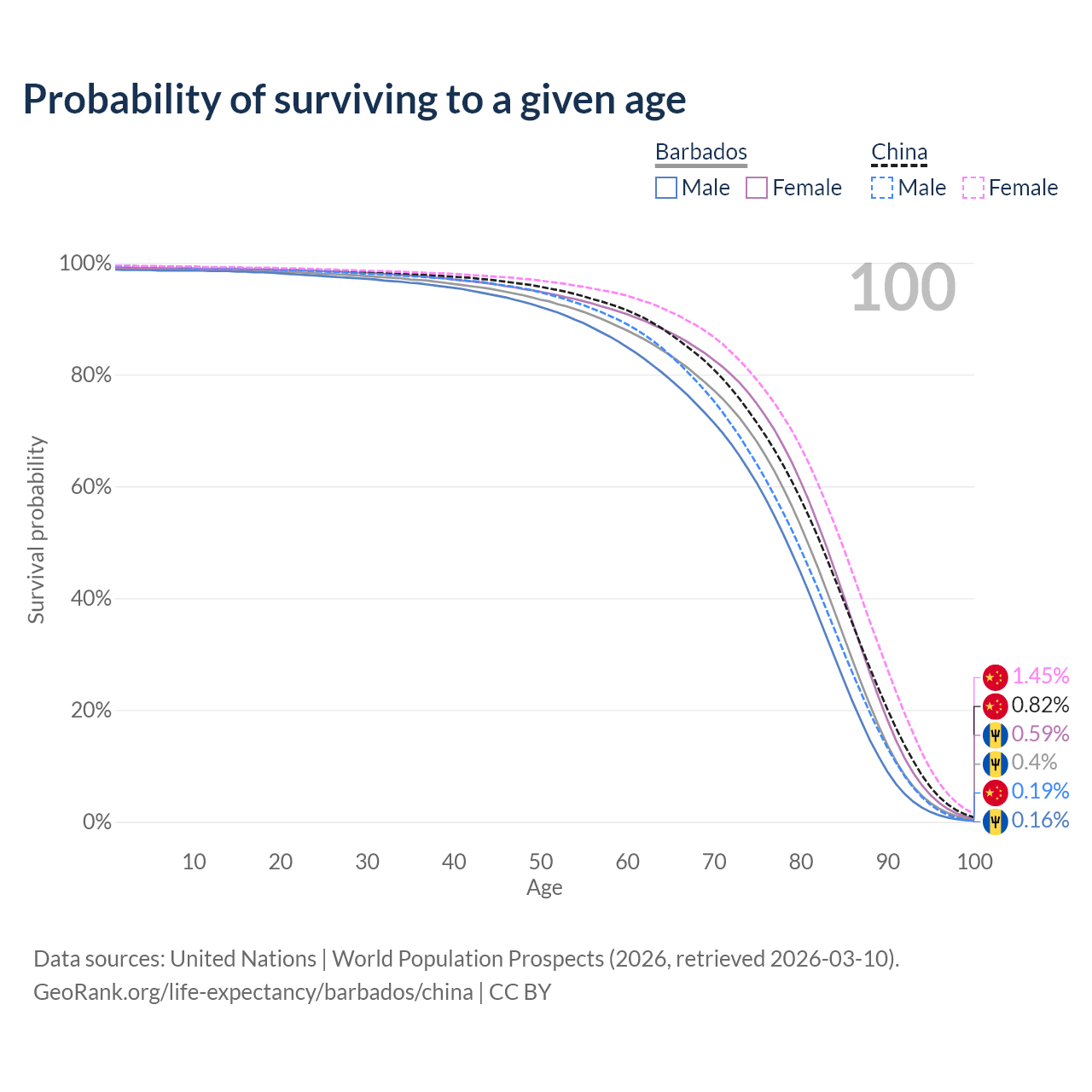 This life expectancy calculator shows the odds of living to 100, 95, 90, and below based on current age for both males and females in Barbados and China, along with mean and median age of death. The calculations are based on the 2026 life tables (actuarial tables) from the UN World Population Prospects.