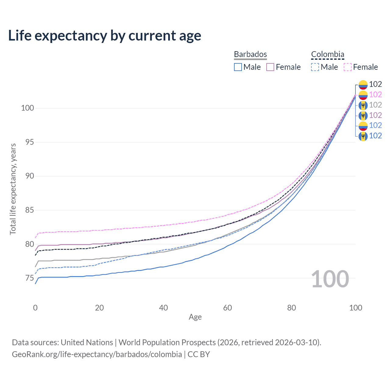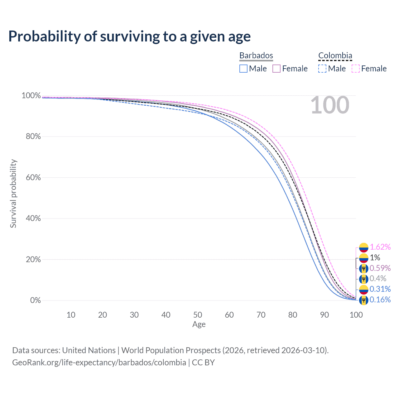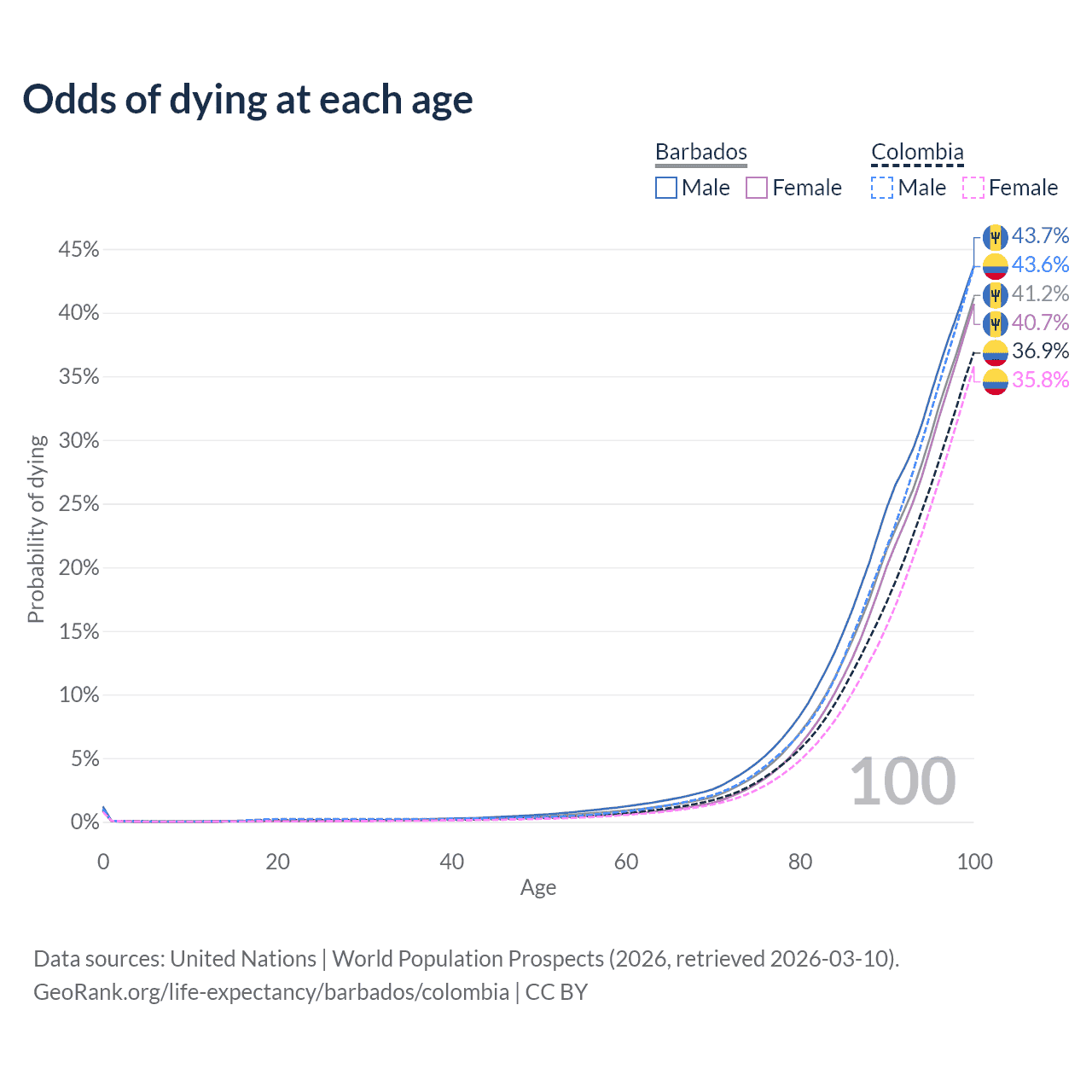 This life expectancy calculator shows the odds of living to 100, 95, 90, and below based on current age for both males and females in Barbados and Colombia, along with mean and median age of death. The calculations are based on the 2026 life tables (actuarial tables) from the UN World Population Prospects.