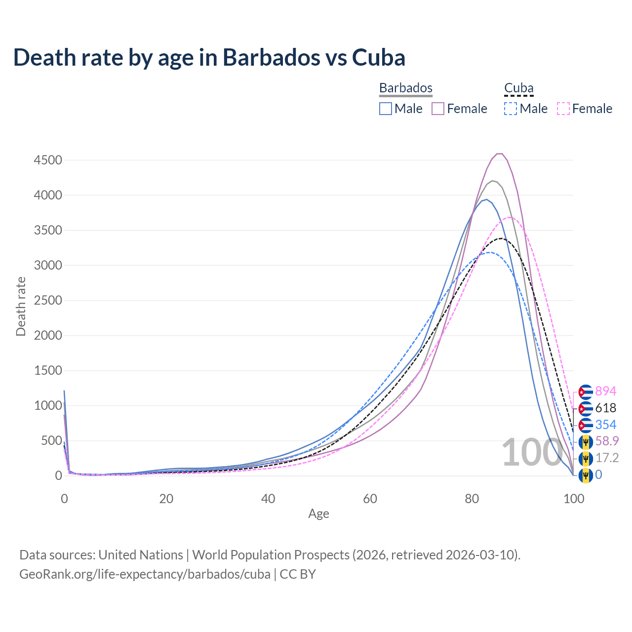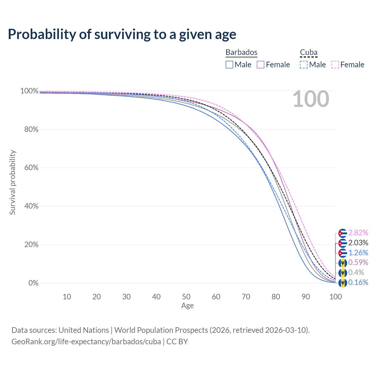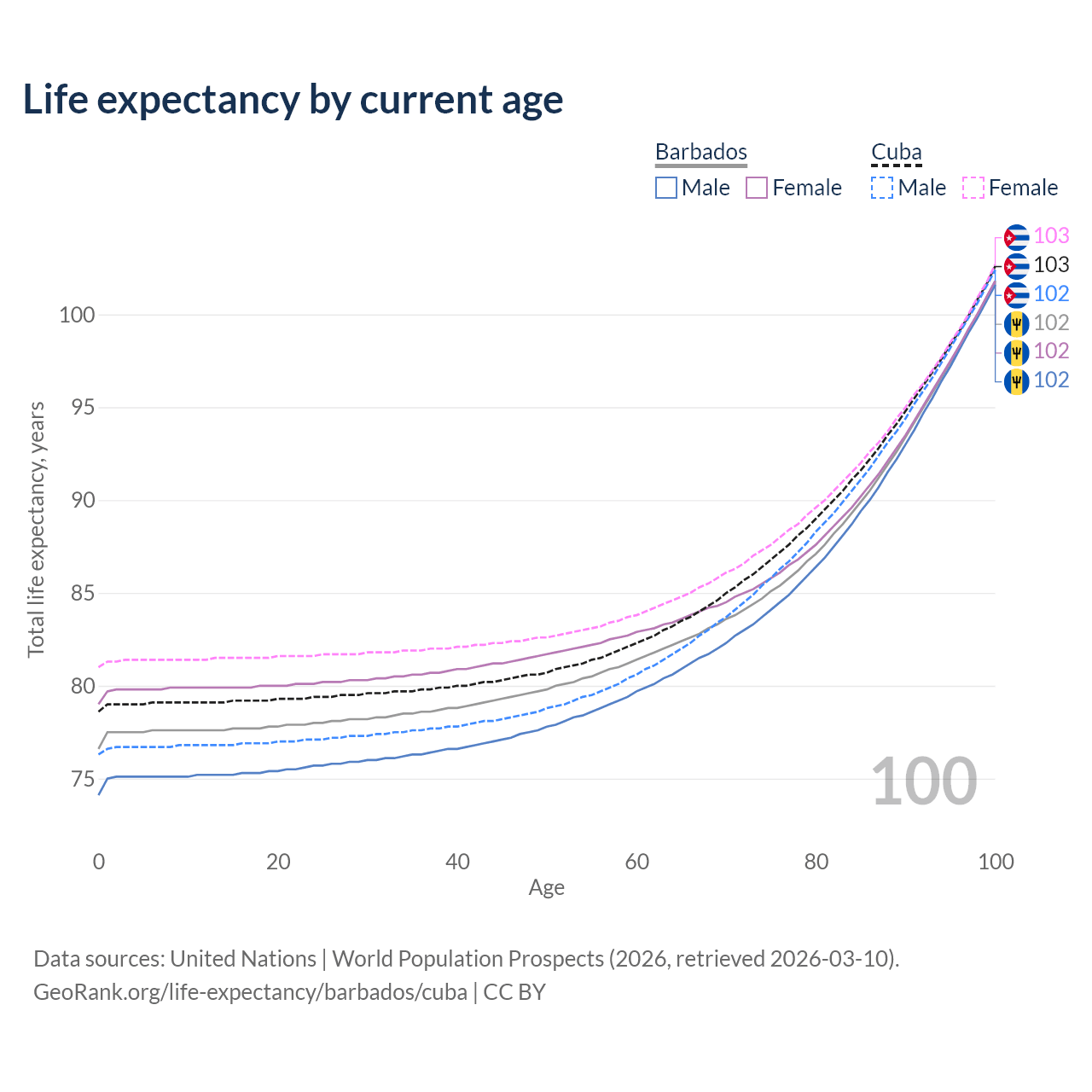 This life expectancy calculator shows the odds of living to 100, 95, 90, and below based on current age for both males and females in Barbados and Cuba, along with mean and median age of death. The calculations are based on the 2026 life tables (actuarial tables) from the UN World Population Prospects.
