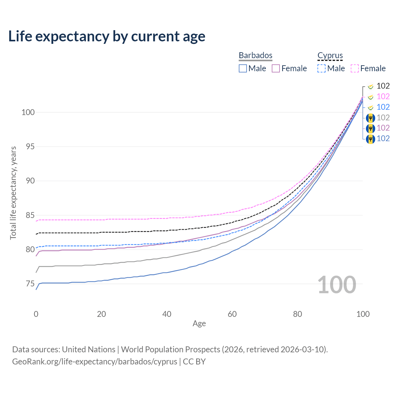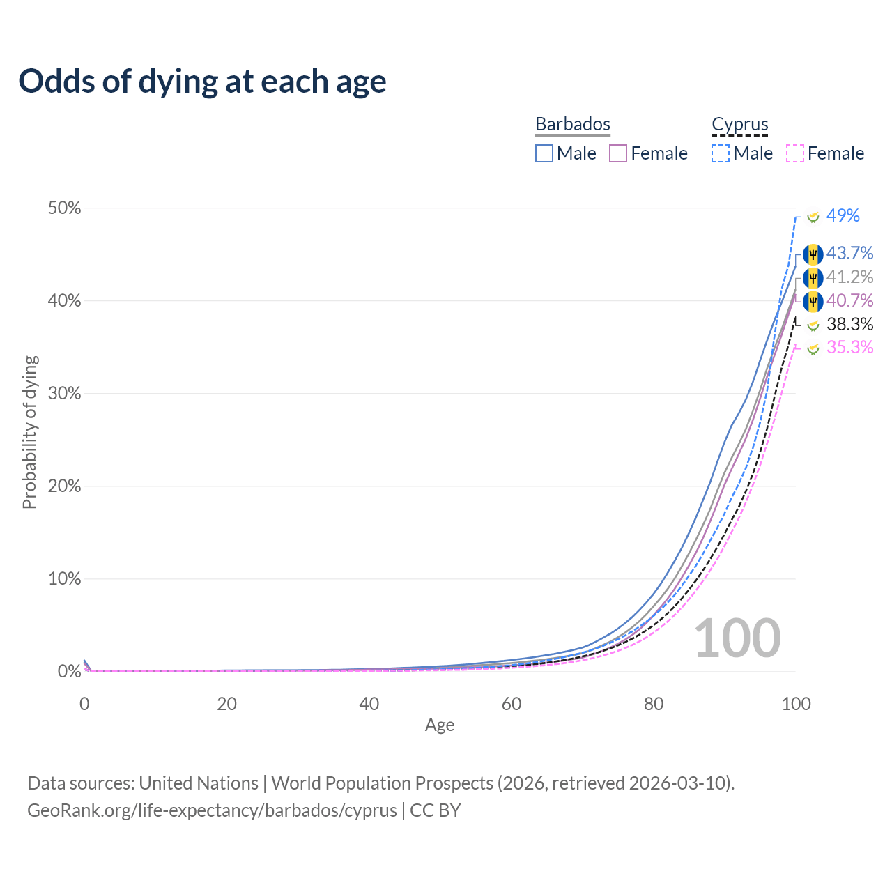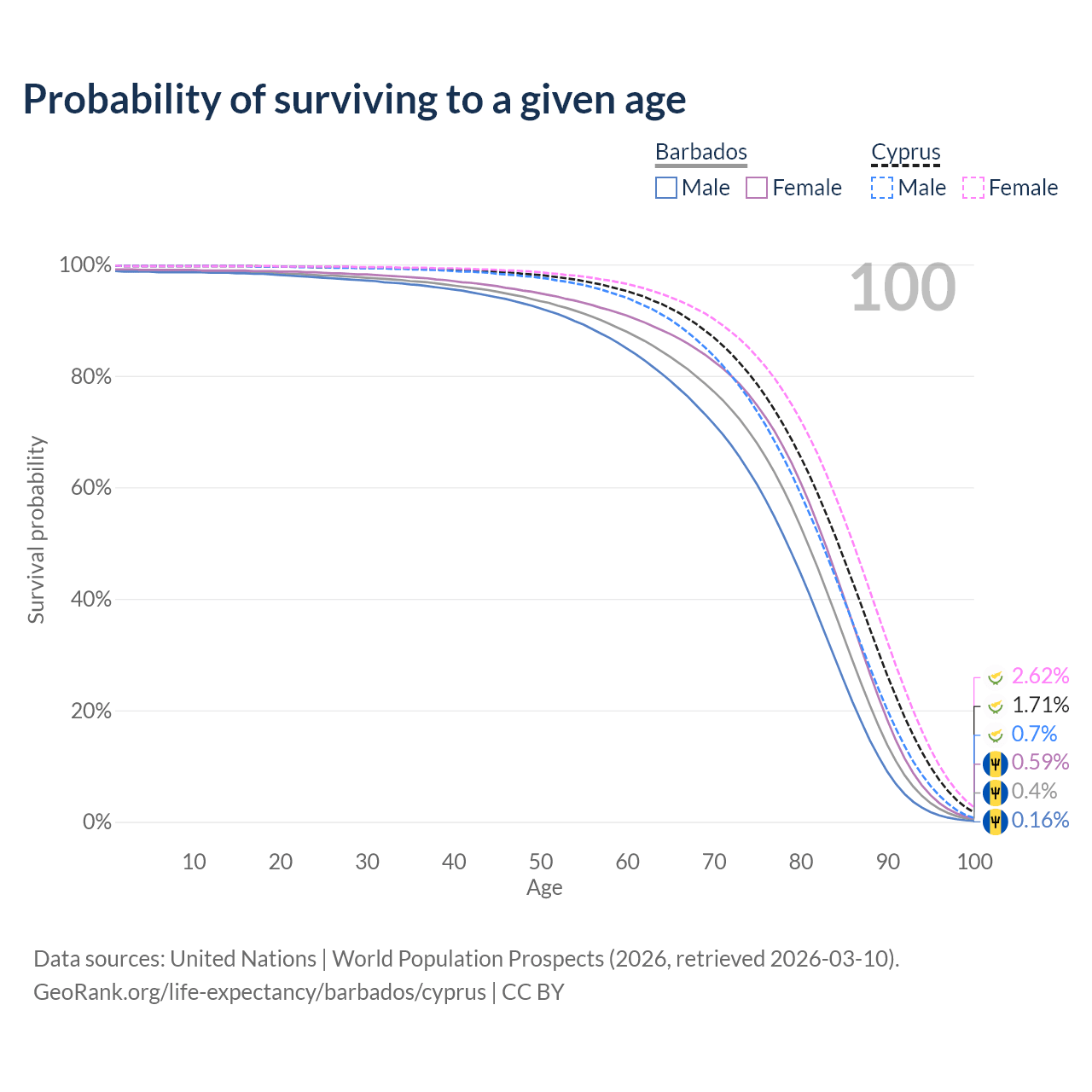 This life expectancy calculator shows the odds of living to 100, 95, 90, and below based on current age for both males and females in Barbados and Cyprus, along with mean and median age of death. The calculations are based on the 2026 life tables (actuarial tables) from the UN World Population Prospects.