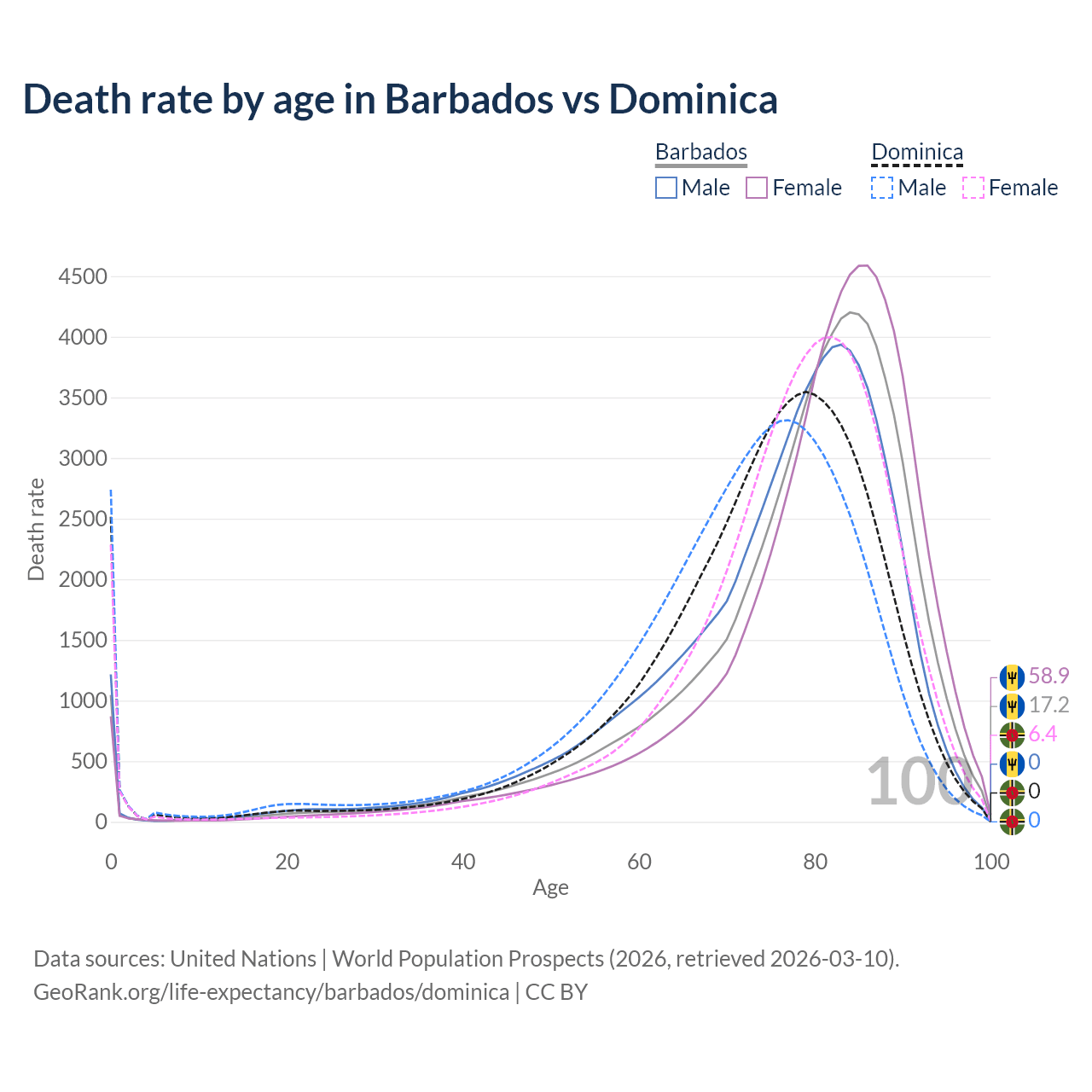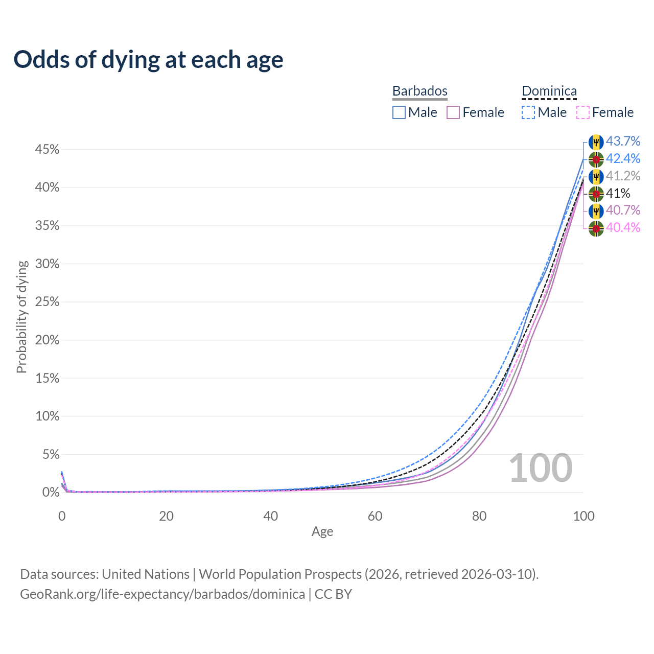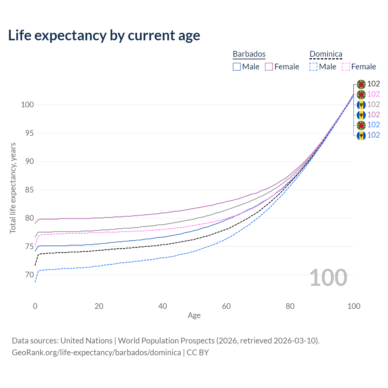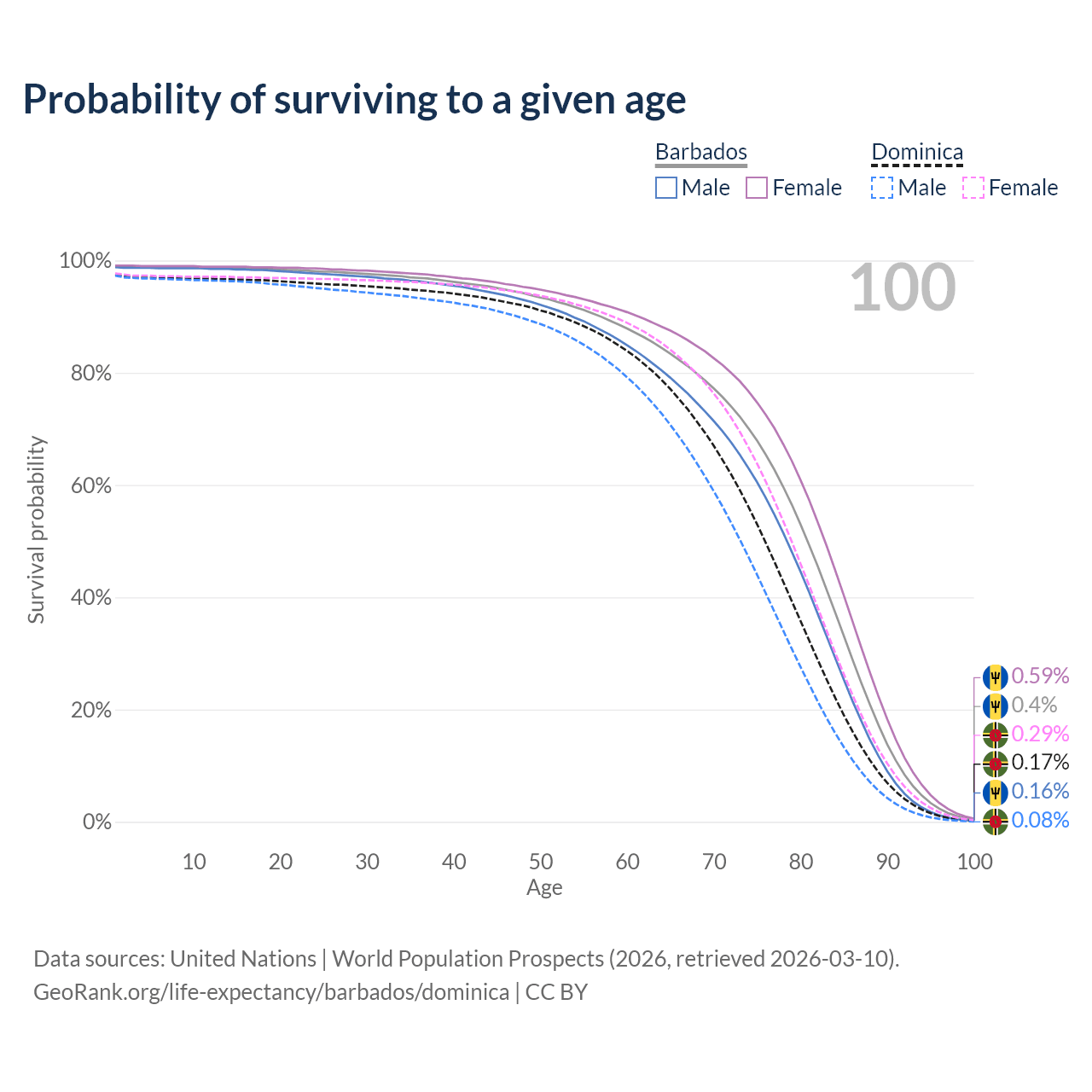 This life expectancy calculator shows the odds of living to 100, 95, 90, and below based on current age for both males and females in Barbados and Dominica, along with mean and median age of death. The calculations are based on the 2026 life tables (actuarial tables) from the UN World Population Prospects.