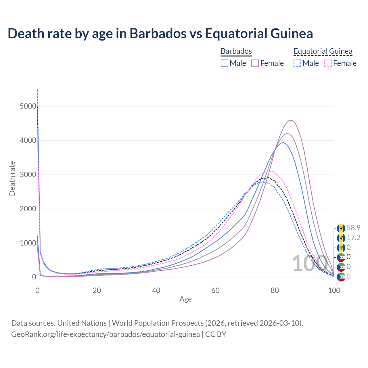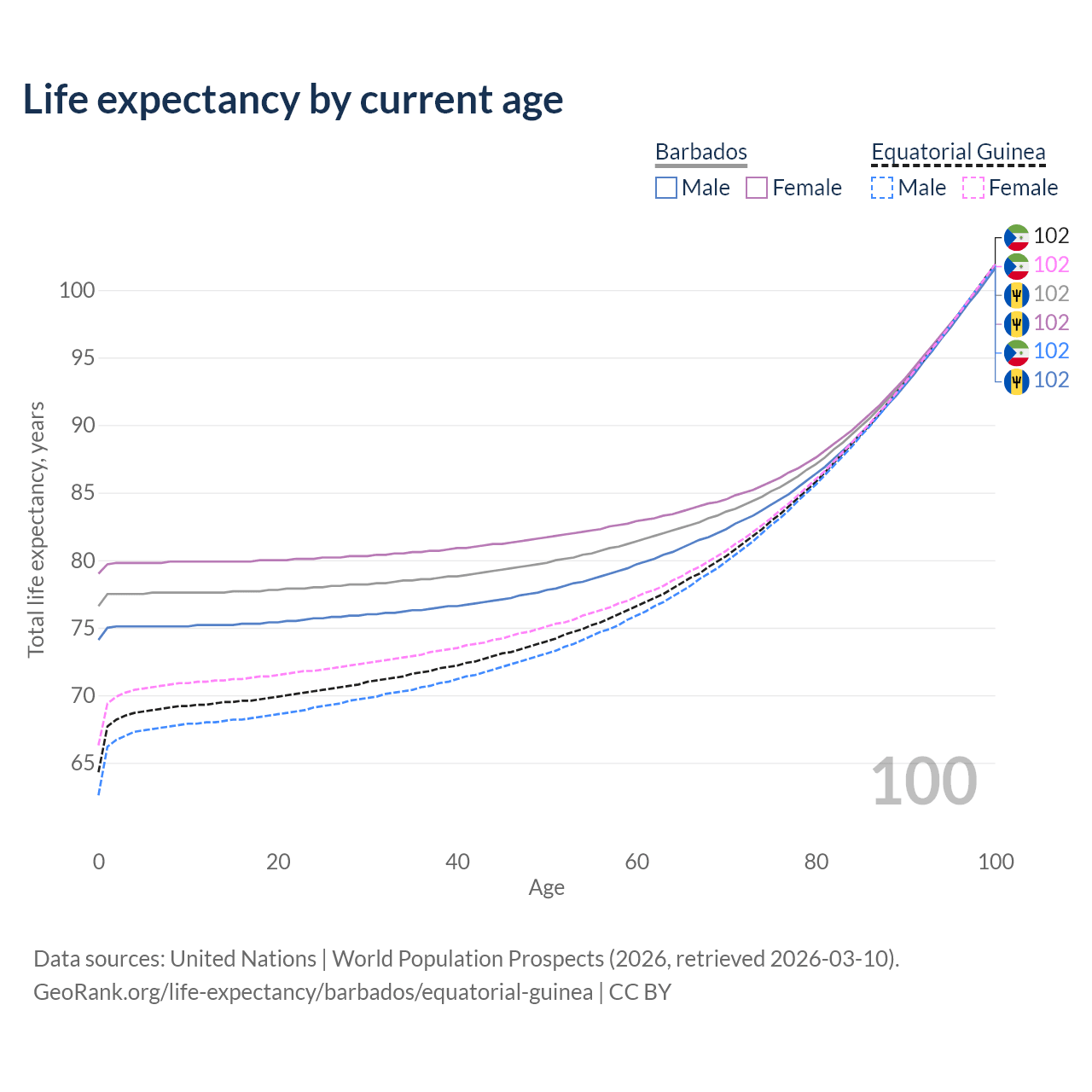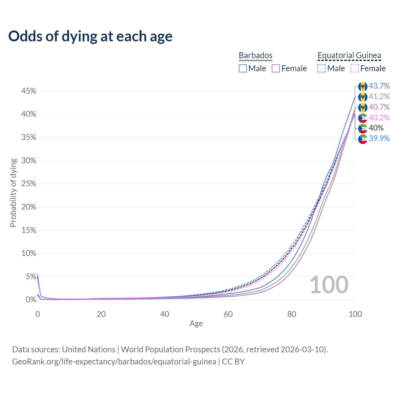 This life expectancy calculator shows the odds of living to 100, 95, 90, and below based on current age for both males and females in Barbados and Equatorial Guinea, along with mean and median age of death. The calculations are based on the 2026 life tables (actuarial tables) from the UN World Population Prospects.