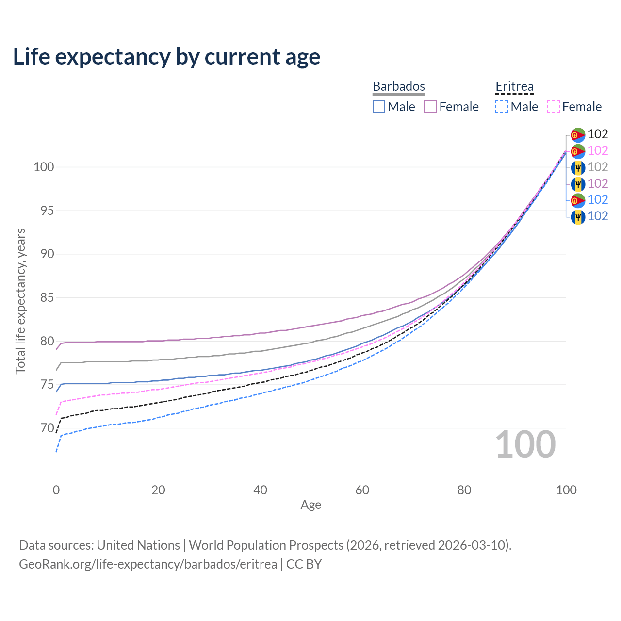 This life expectancy calculator shows the odds of living to 100, 95, 90, and below based on current age for both males and females in Barbados and Eritrea, along with mean and median age of death. The calculations are based on the 2026 life tables (actuarial tables) from the UN World Population Prospects.