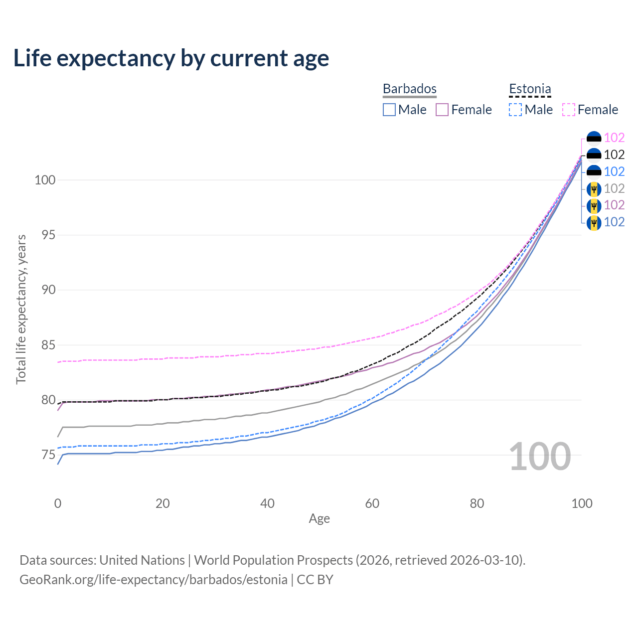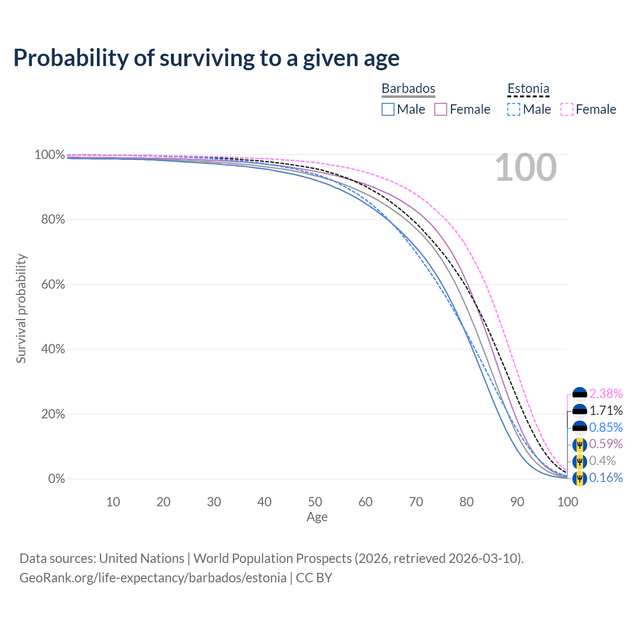 This life expectancy calculator shows the odds of living to 100, 95, 90, and below based on current age for both males and females in Barbados and Estonia, along with mean and median age of death. The calculations are based on the 2026 life tables (actuarial tables) from the UN World Population Prospects.