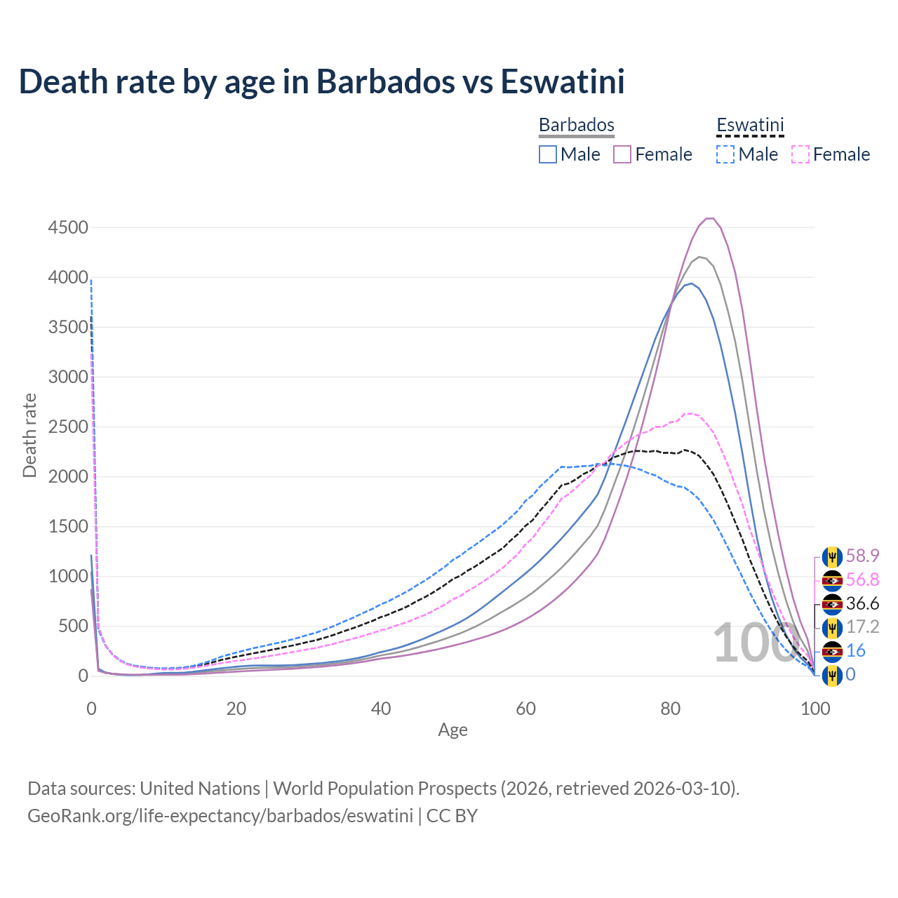 In Barbados, the most common age of death is 84, compared to 0 in Eswatini. The median age of death is 80.8 in Barbados and 69.7 in Eswatini, meaning only half of each cohort is expected to live past that age.