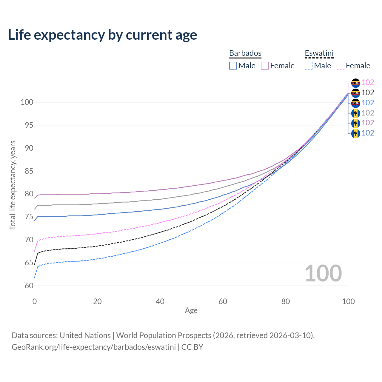 This life expectancy calculator shows the odds of living to 100, 95, 90, and below based on current age for both males and females in Barbados and Eswatini, along with mean and median age of death. The calculations are based on the 2026 life tables (actuarial tables) from the UN World Population Prospects.
