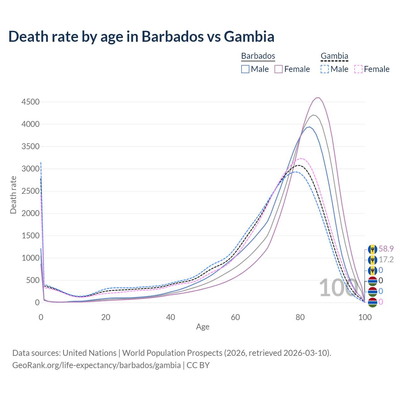 In Barbados, the most common age of death is 84, compared to 80 in the Gambia. The median age of death is 80.8 in Barbados and 73.4 in the Gambia, meaning only half of each cohort is expected to live past that age.