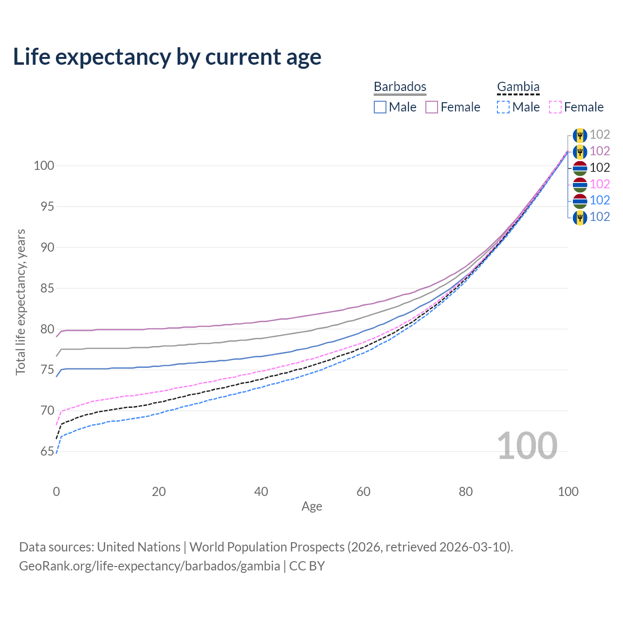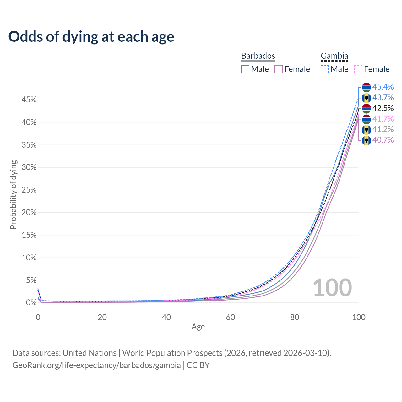 This life expectancy calculator shows the odds of living to 100, 95, 90, and below based on current age for both males and females in Barbados and the Gambia, along with mean and median age of death. The calculations are based on the 2026 life tables (actuarial tables) from the UN World Population Prospects.