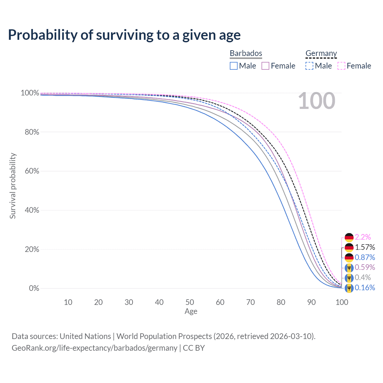 This life expectancy calculator shows the odds of living to 100, 95, 90, and below based on current age for both males and females in Barbados and Germany, along with mean and median age of death. The calculations are based on the 2026 life tables (actuarial tables) from the UN World Population Prospects.