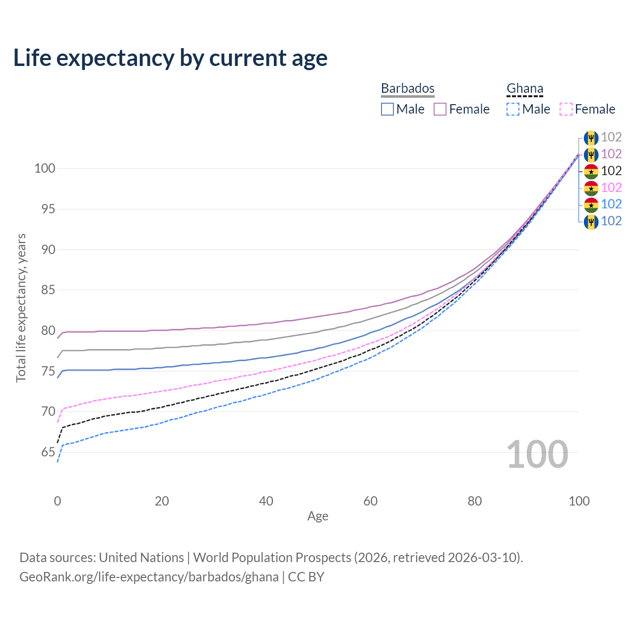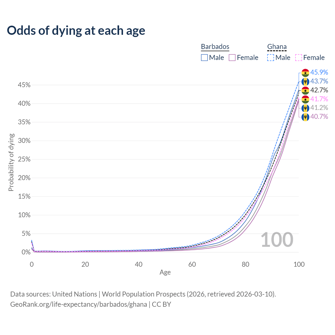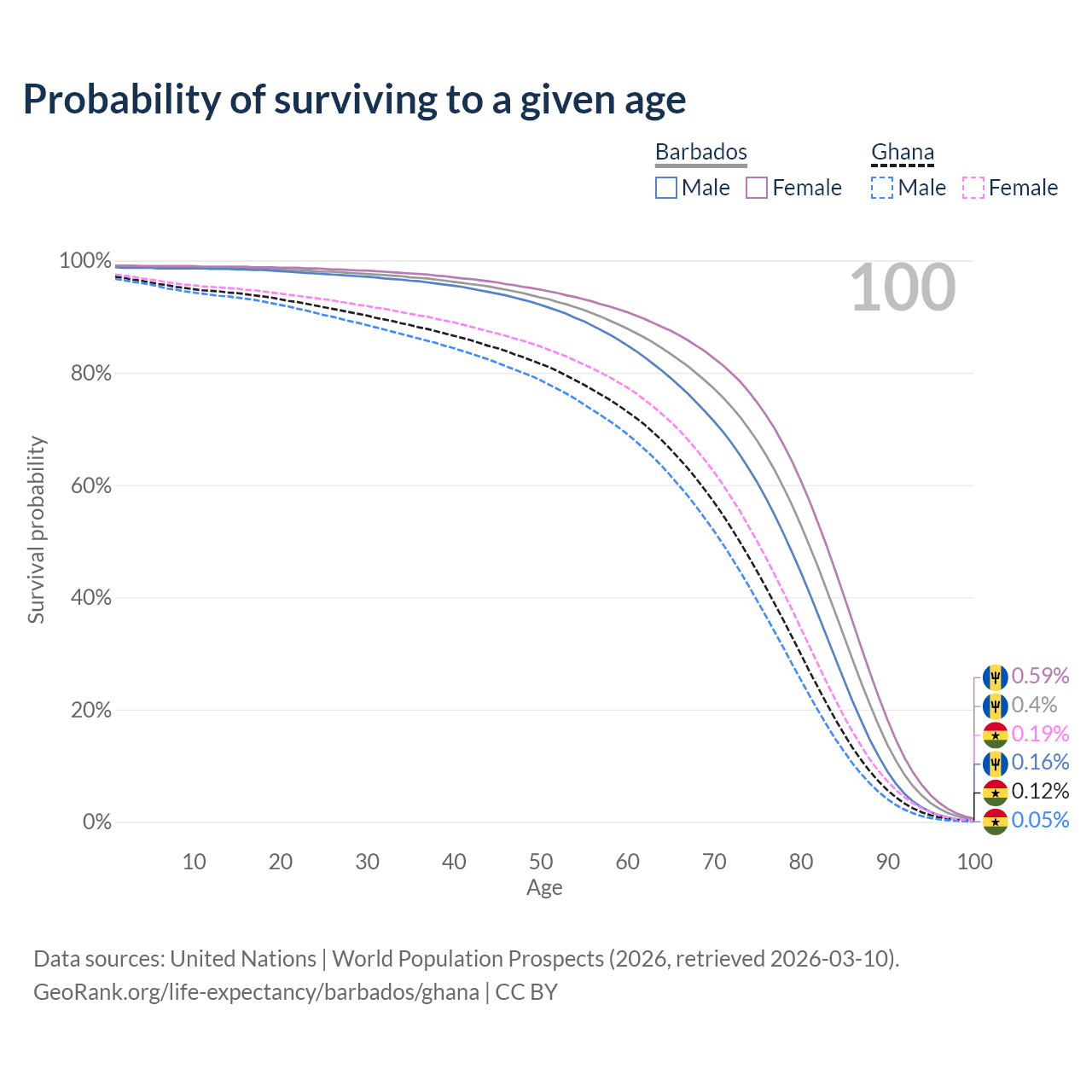 This life expectancy calculator shows the odds of living to 100, 95, 90, and below based on current age for both males and females in Barbados and Ghana, along with mean and median age of death. The calculations are based on the 2026 life tables (actuarial tables) from the UN World Population Prospects.