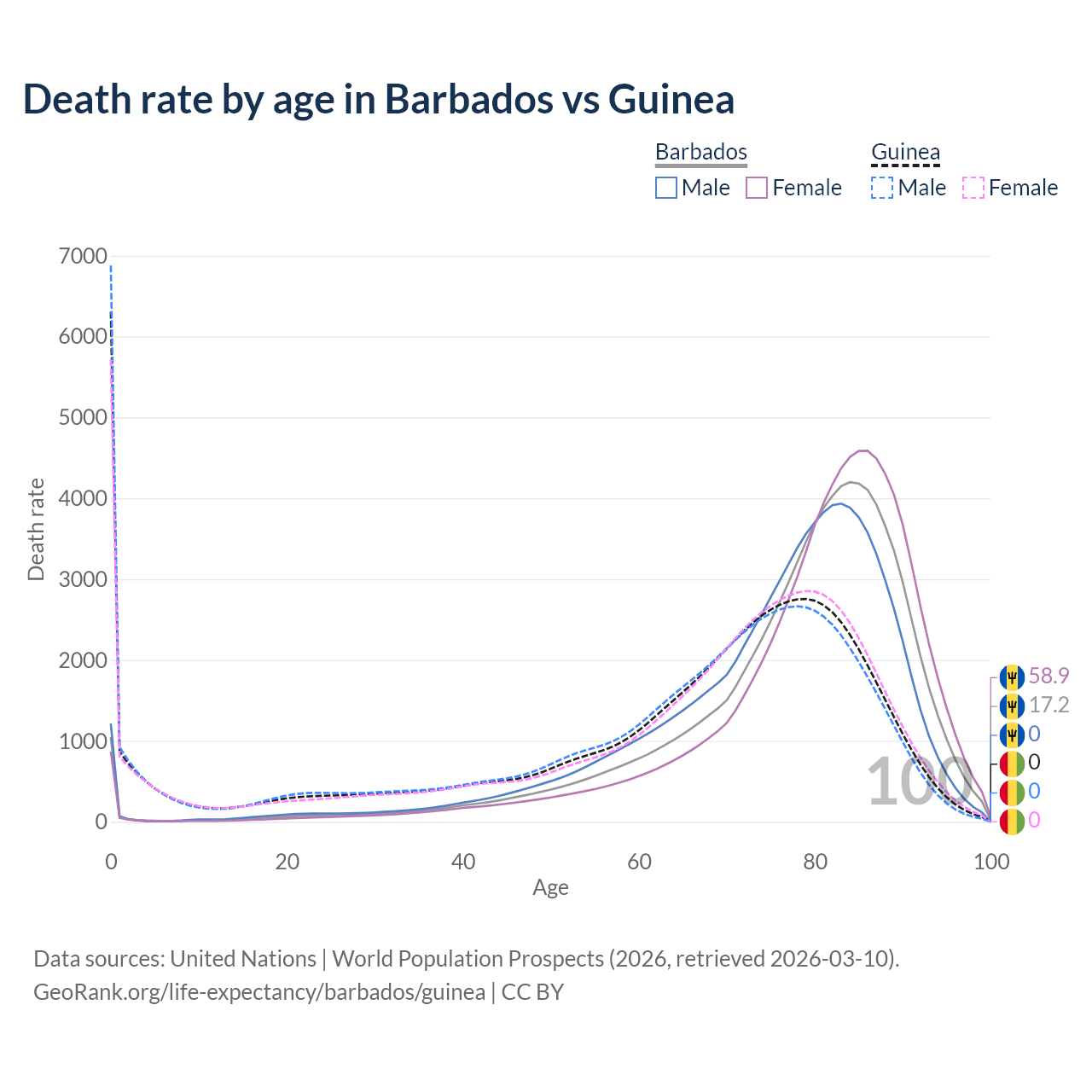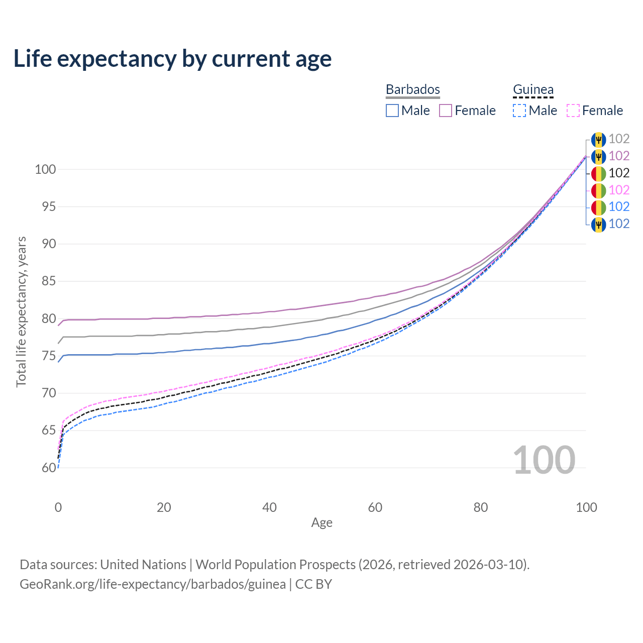 This life expectancy calculator shows the odds of living to 100, 95, 90, and below based on current age for both males and females in Barbados and Guinea, along with mean and median age of death. The calculations are based on the 2026 life tables (actuarial tables) from the UN World Population Prospects.