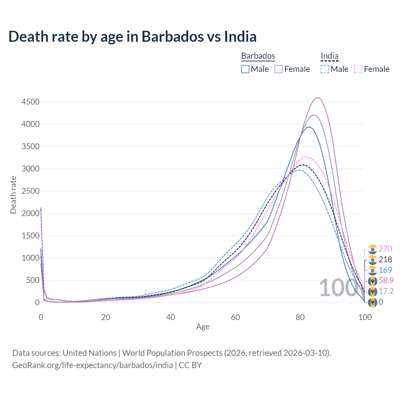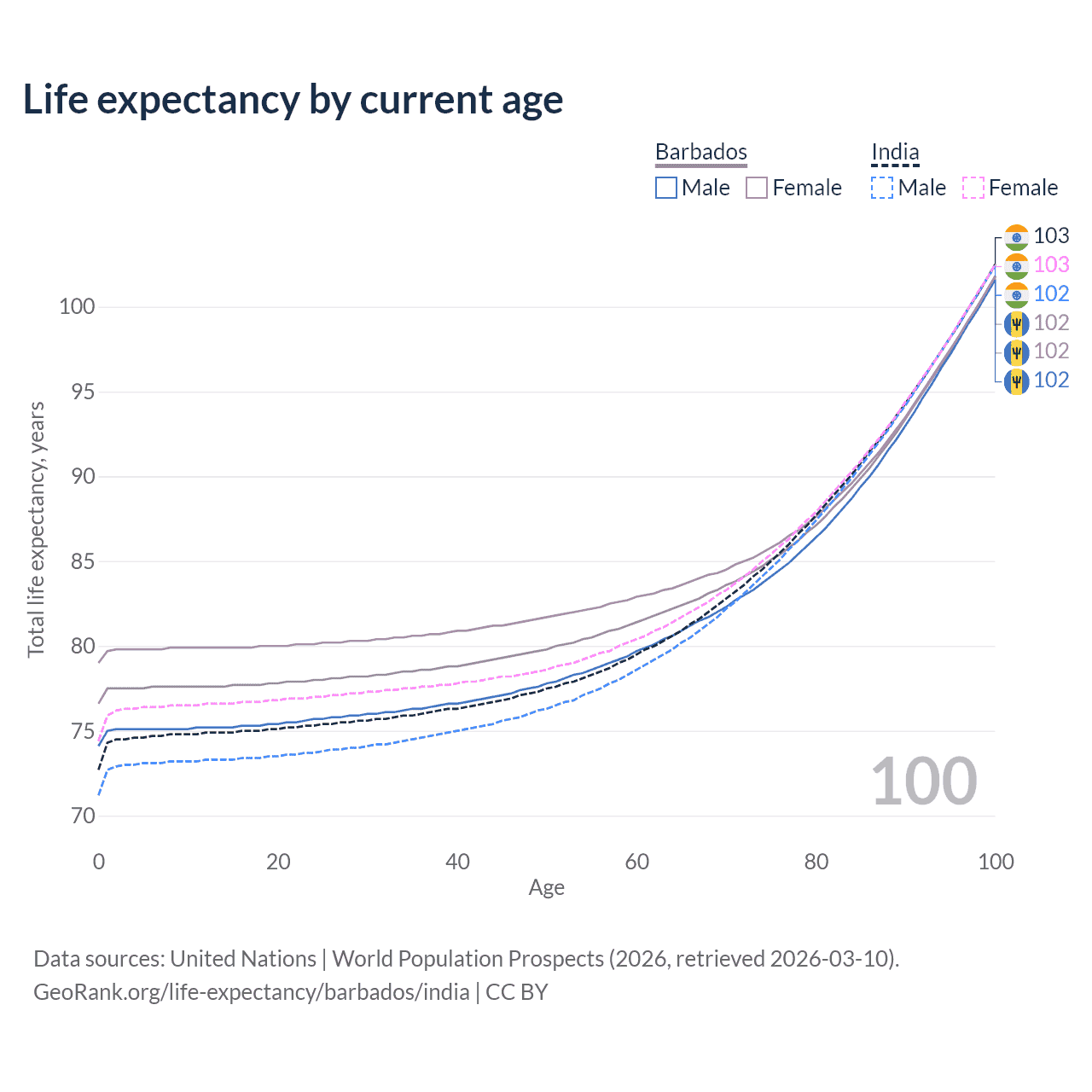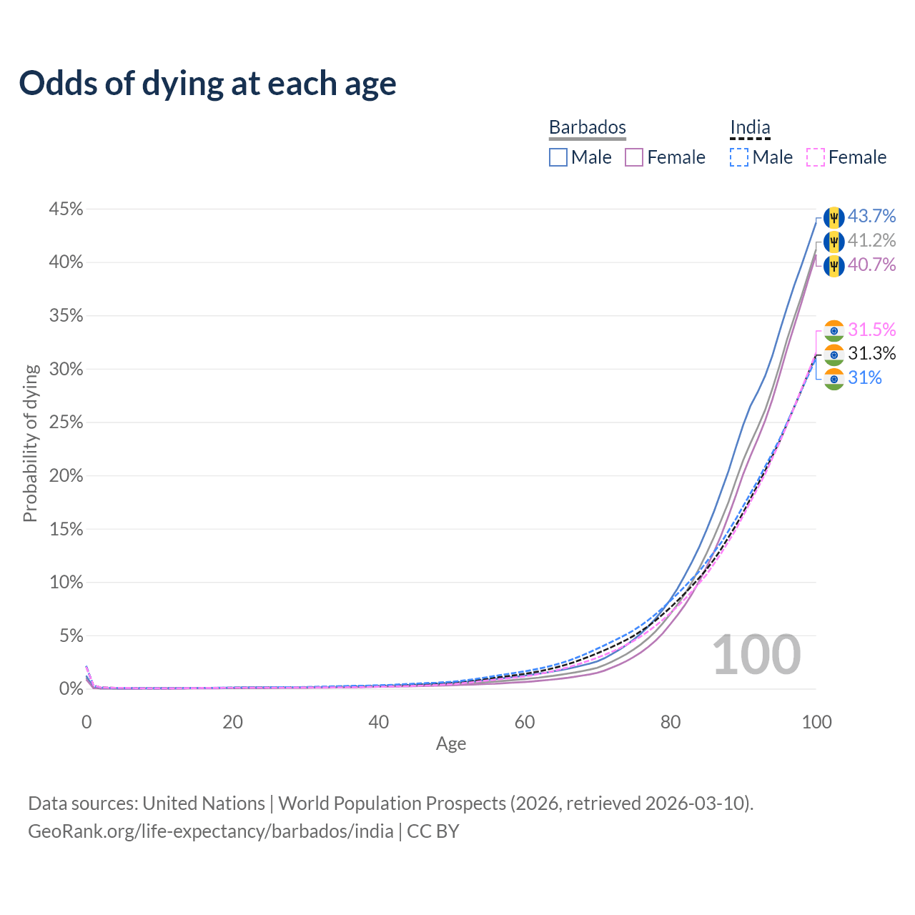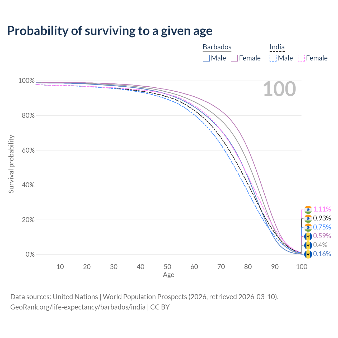 This life expectancy calculator shows the odds of living to 100, 95, 90, and below based on current age for both males and females in Barbados and India, along with mean and median age of death. The calculations are based on the 2026 life tables (actuarial tables) from the UN World Population Prospects.