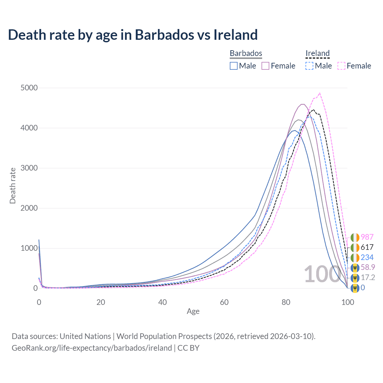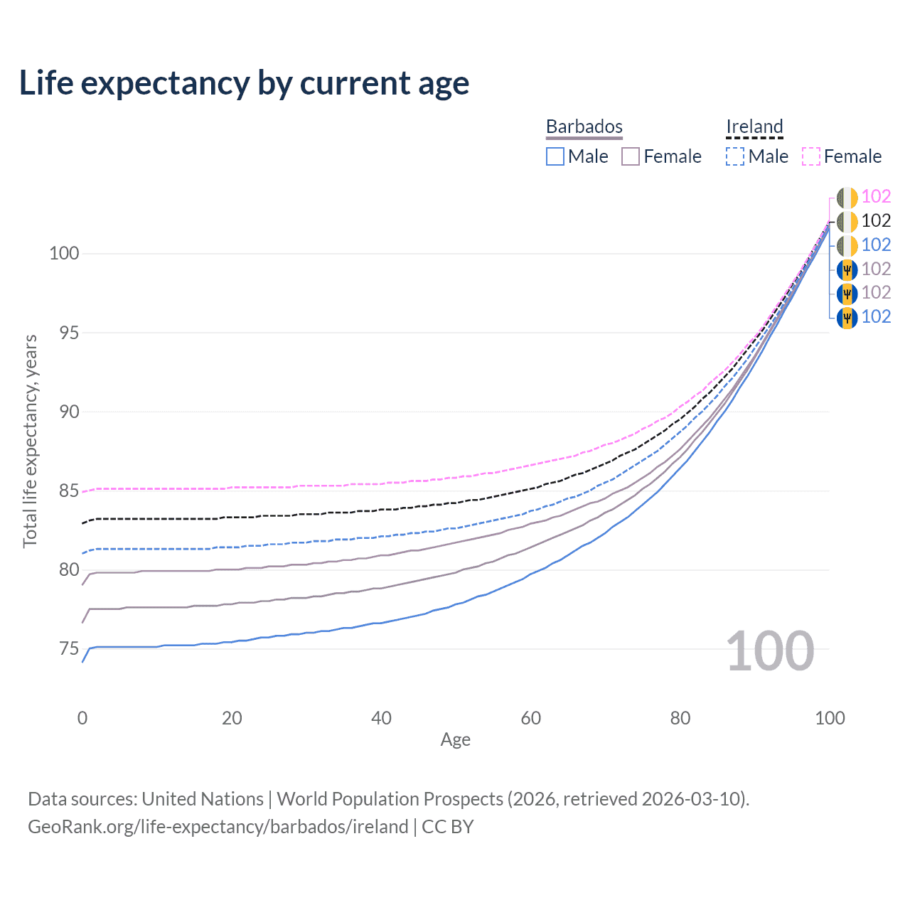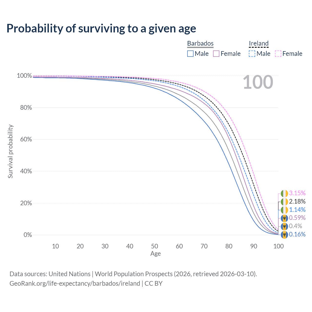 This life expectancy calculator shows the odds of living to 100, 95, 90, and below based on current age for both males and females in Barbados and Ireland, along with mean and median age of death. The calculations are based on the 2026 life tables (actuarial tables) from the UN World Population Prospects.