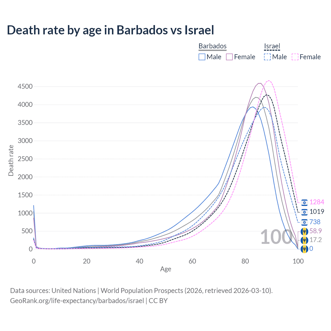 In Barbados, the most common age of death is 84, compared to 88 in Israel. The median age of death is 80.8 in Barbados and 85.6 in Israel, meaning only half of each cohort is expected to live past that age.
