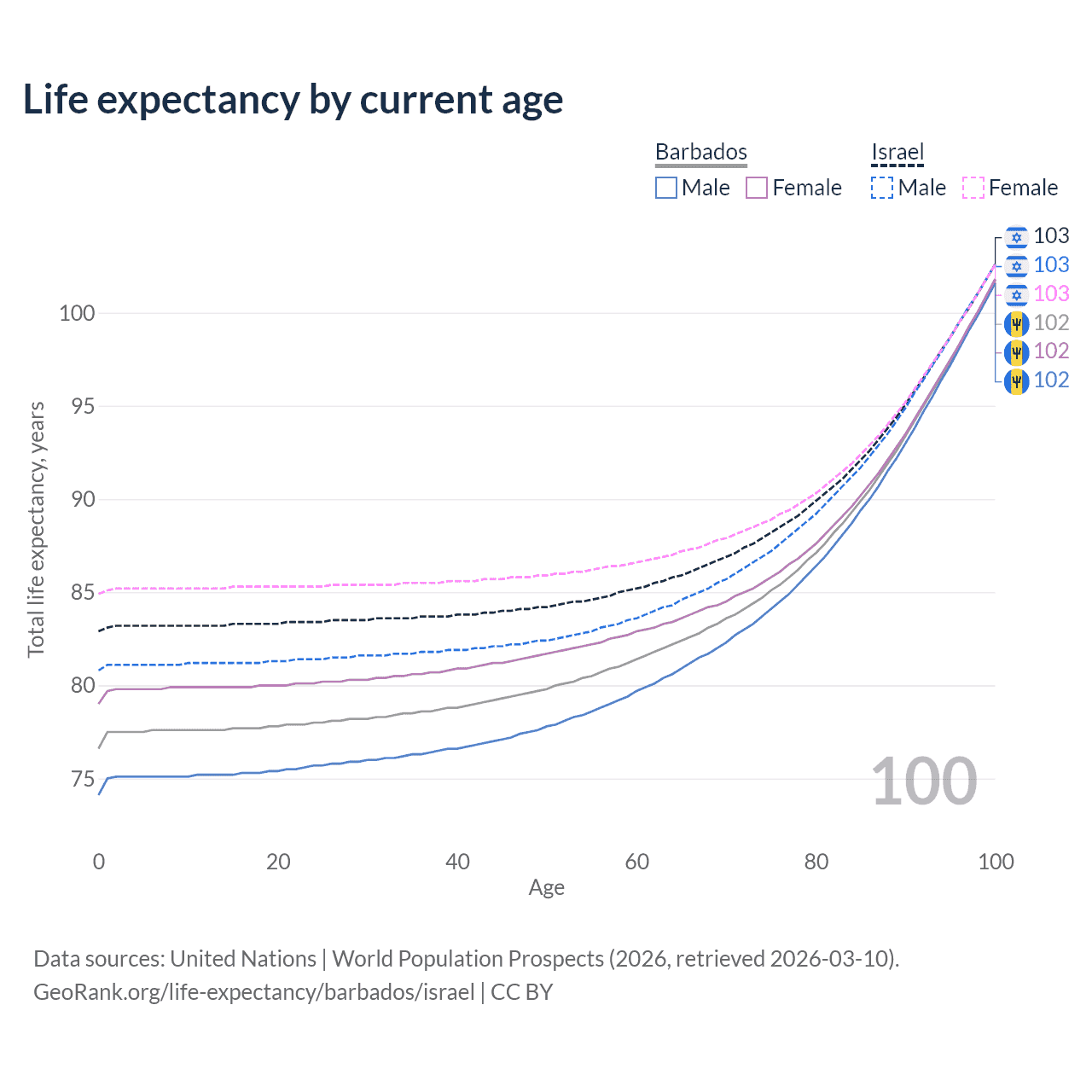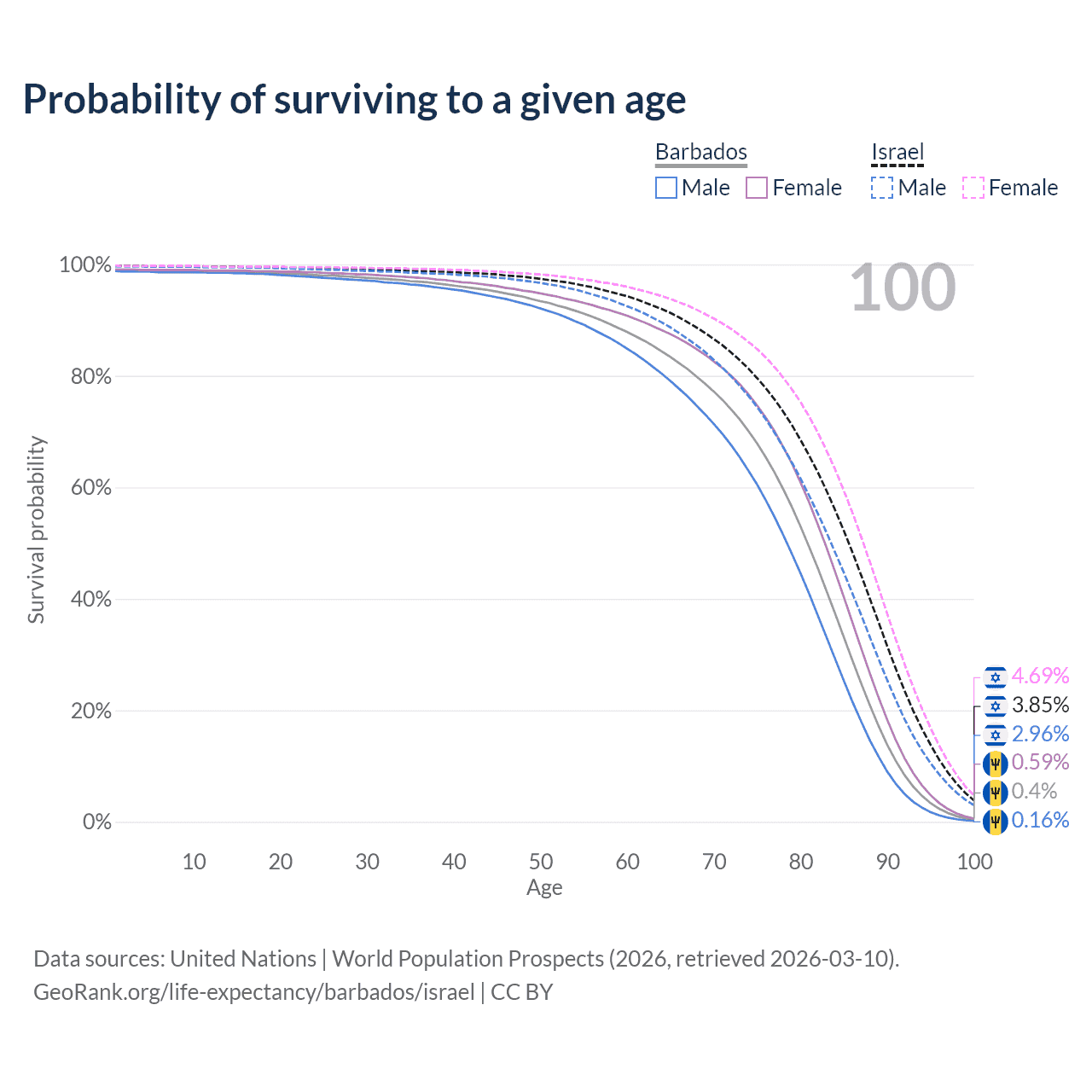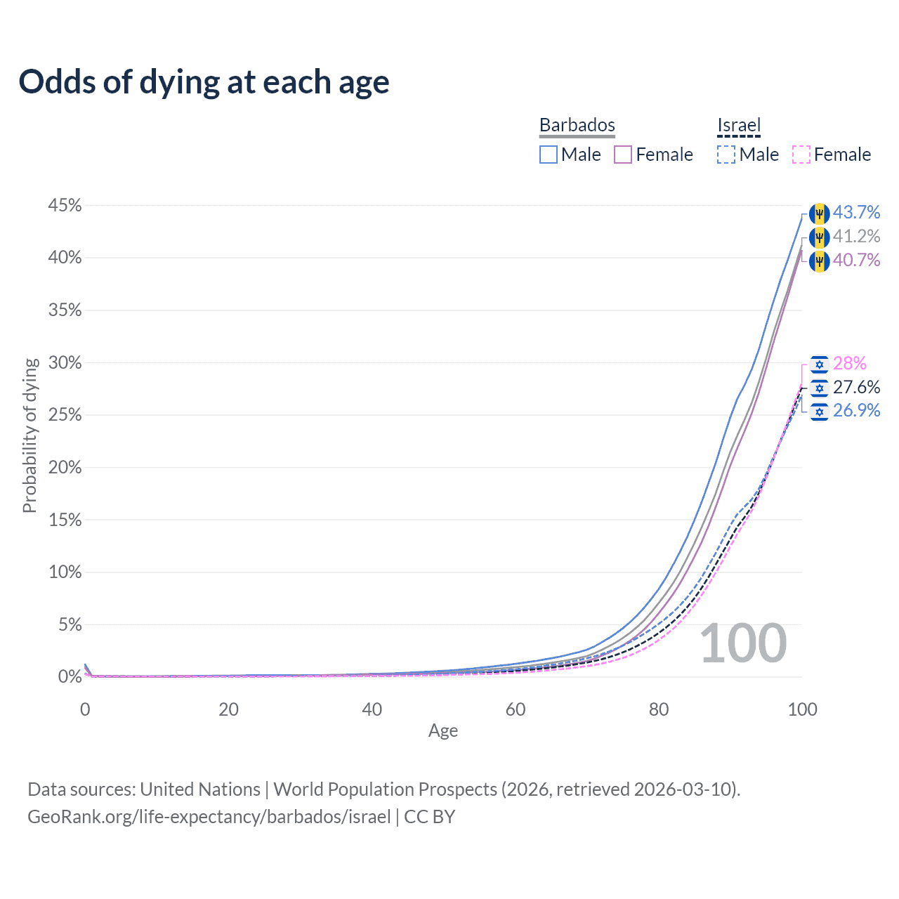 This life expectancy calculator shows the odds of living to 100, 95, 90, and below based on current age for both males and females in Barbados and Israel, along with mean and median age of death. The calculations are based on the 2026 life tables (actuarial tables) from the UN World Population Prospects.