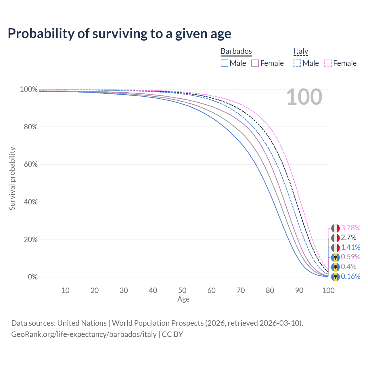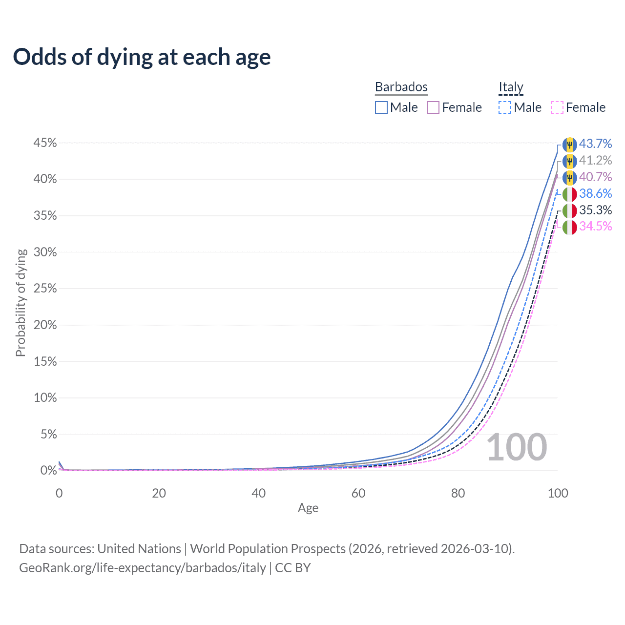 This life expectancy calculator shows the odds of living to 100, 95, 90, and below based on current age for both males and females in Barbados and Italy, along with mean and median age of death. The calculations are based on the 2026 life tables (actuarial tables) from the UN World Population Prospects.